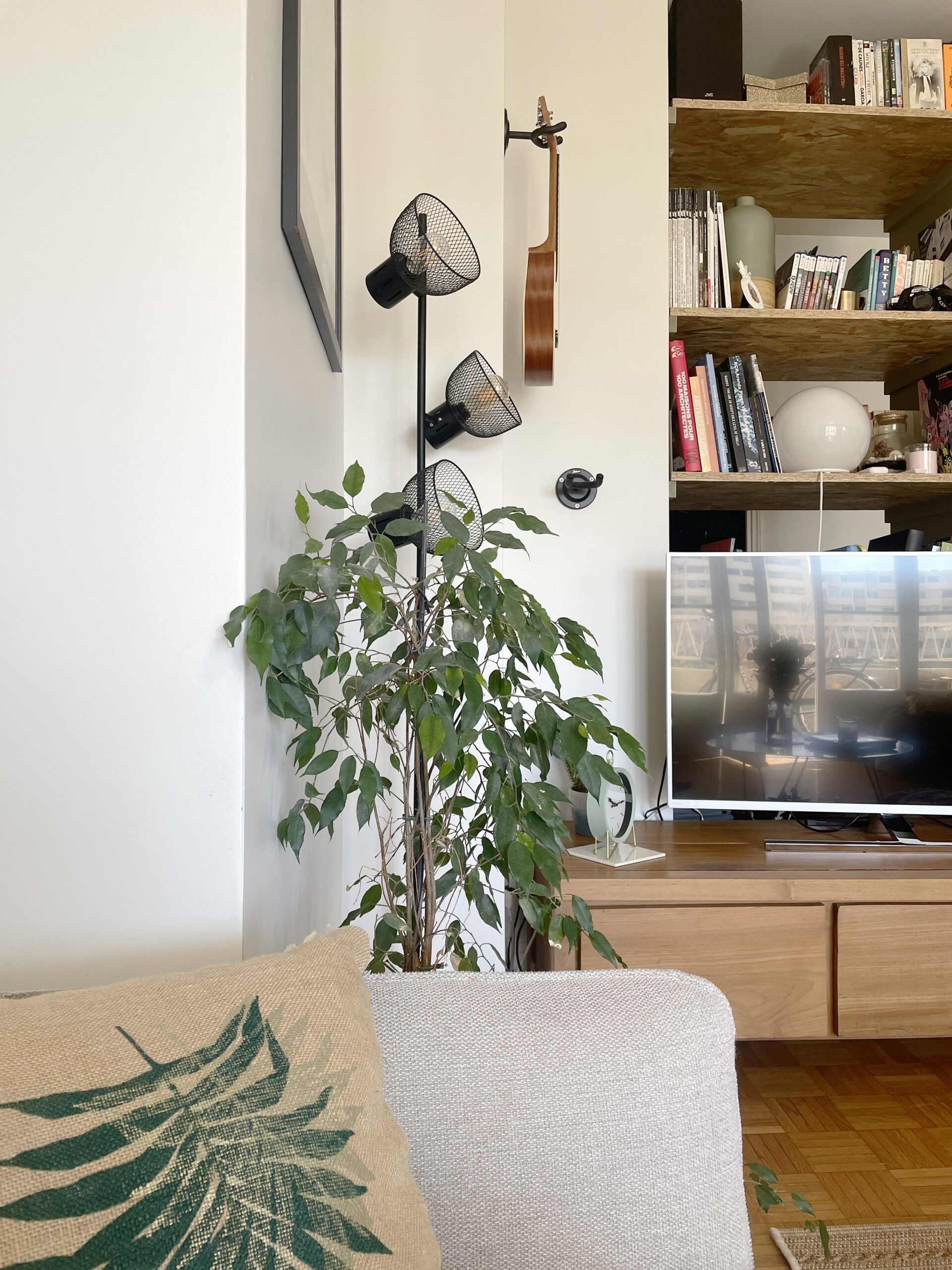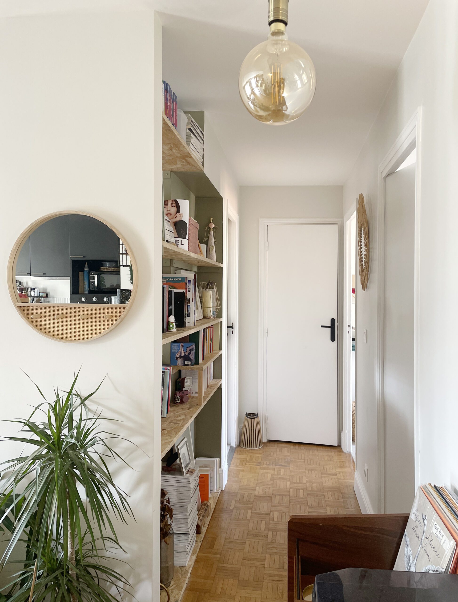 Afin d’ouvrir l’espace et de créer une pièce de vie spacieuse et agréable, la cloison de l’entrée et de la cuisine ont été démolies, ainsi que le placard.