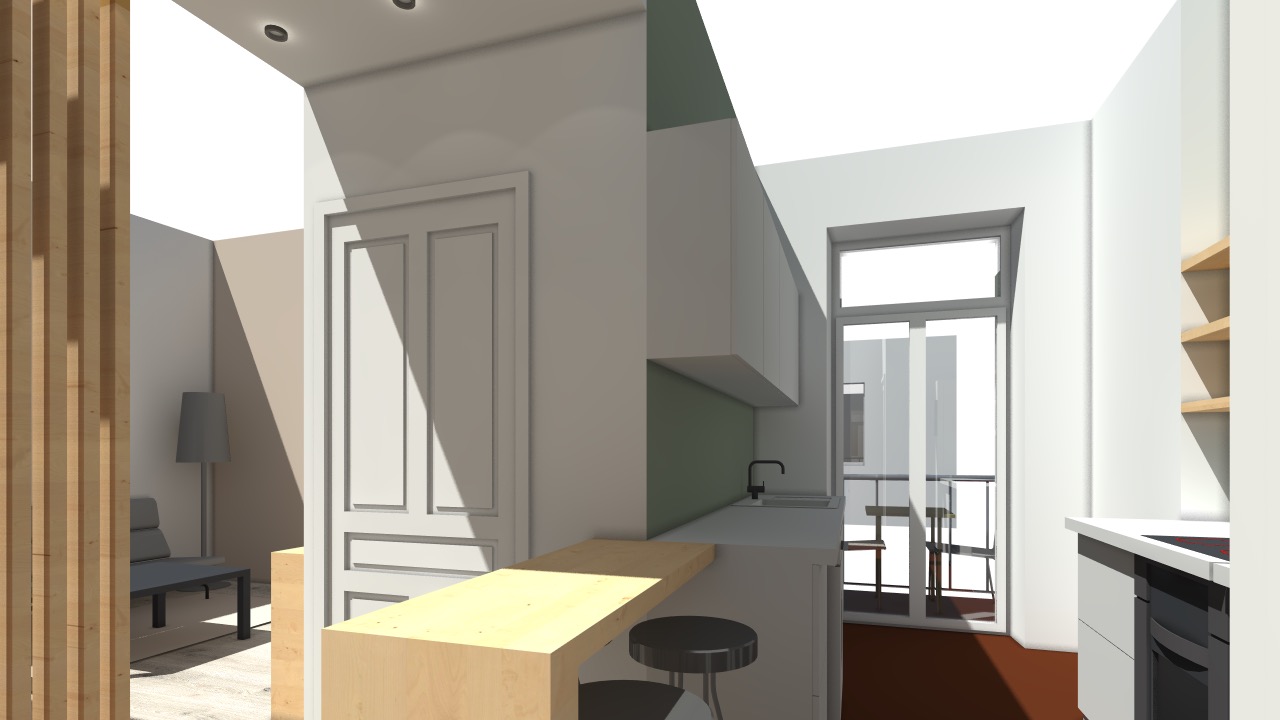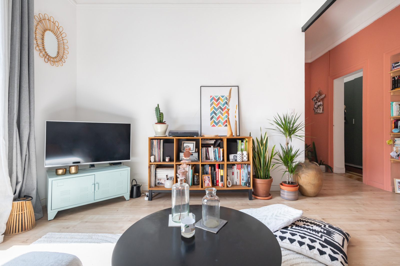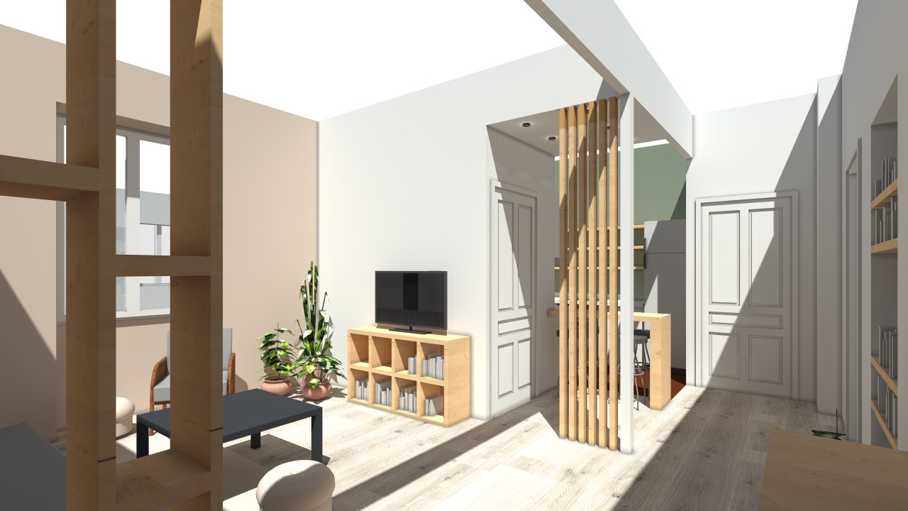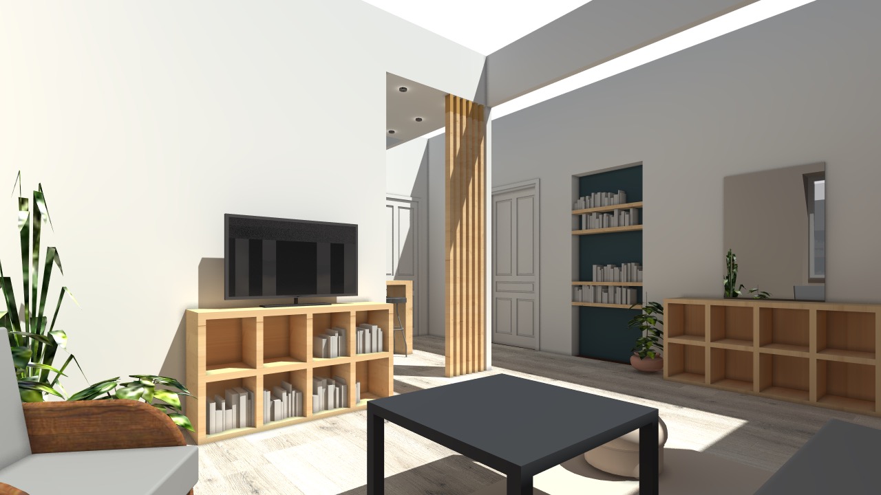 L’ensemble des pièces a été retravaillé et réaménagé. L’ancien salon est devenu chambre et la chambre, au moyen de la démolition de la cloison qui la séparait du couloir, est devenue le salon. Une poutre à l’aspect industriel conservé est venue assurer la démolition de la cloison potentiellement devenue porteuse. Les peintures ont été entièrement refaites, les murs légèrement ratissés et le mobilier a été changé.