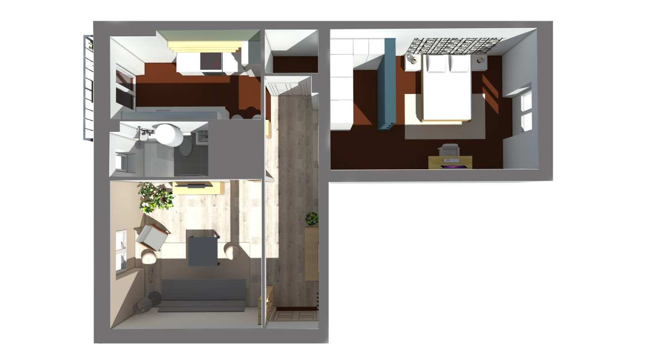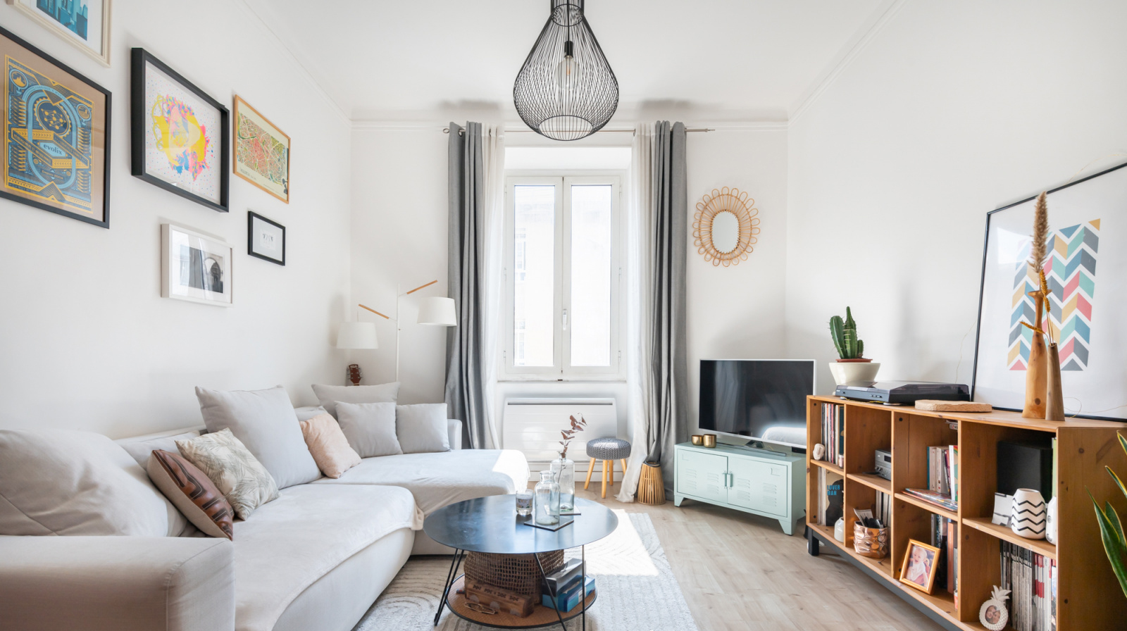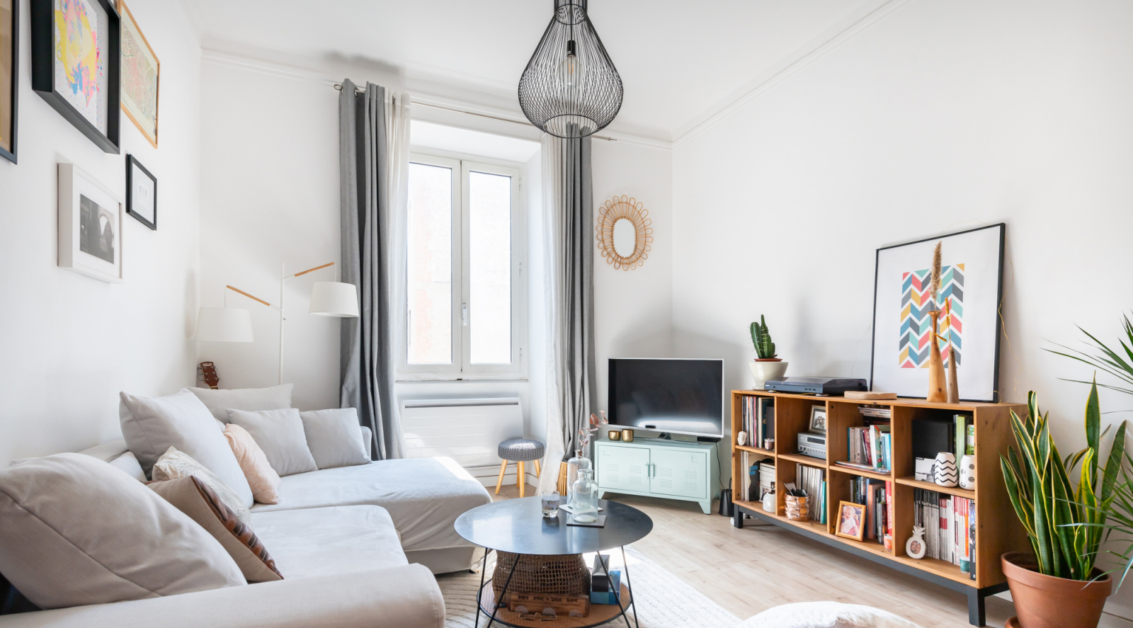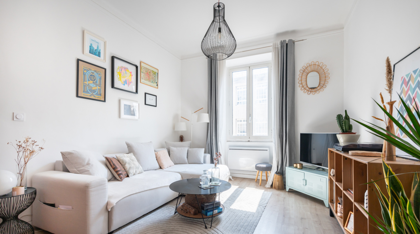 L’ensemble des pièces a été retravaillé et réaménagé. L’ancien salon est devenu chambre et la chambre, au moyen de la démolition de la cloison qui la séparait du couloir, est devenue le salon. Une poutre à l’aspect industriel conservé est venue assurer la démolition de la cloison potentiellement devenue porteuse. Les peintures ont été entièrement refaites, les murs légèrement ratissés et le mobilier a été changé.