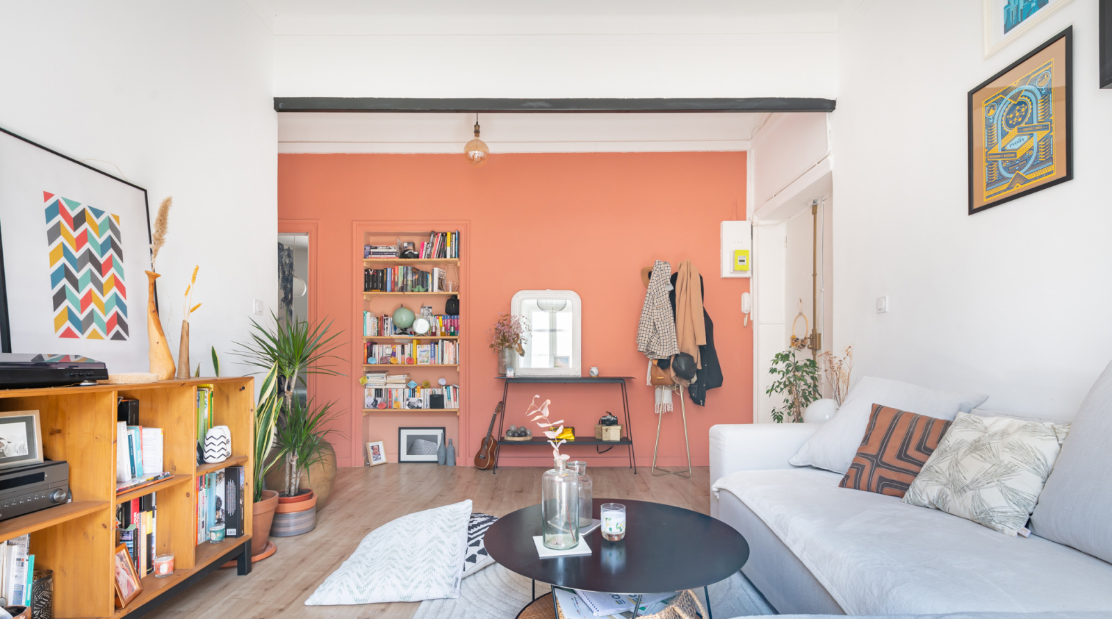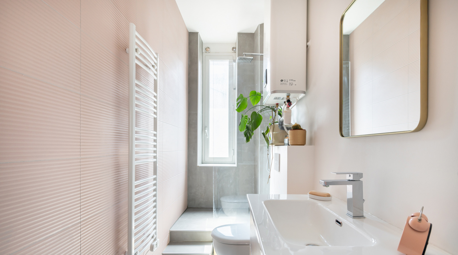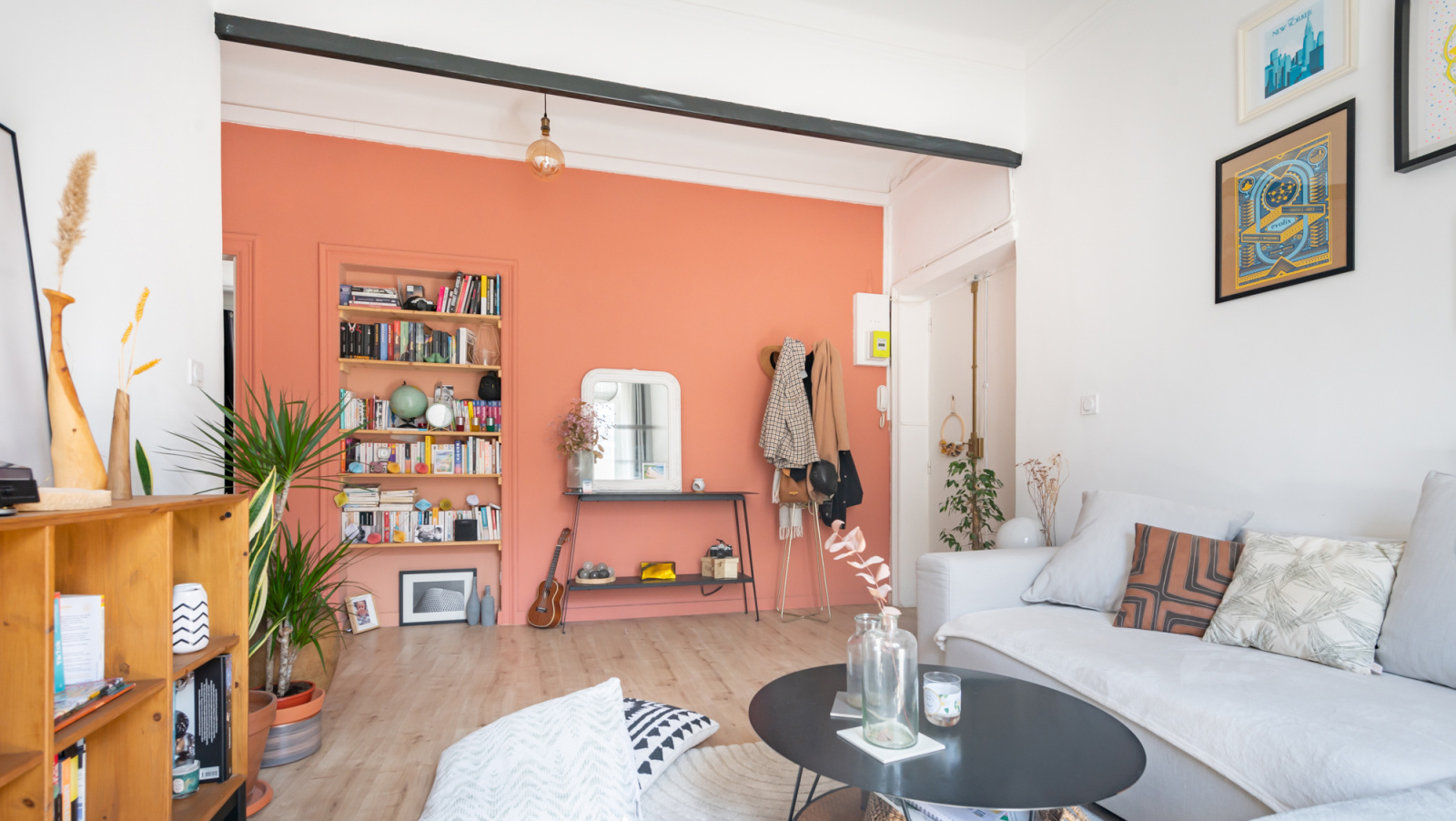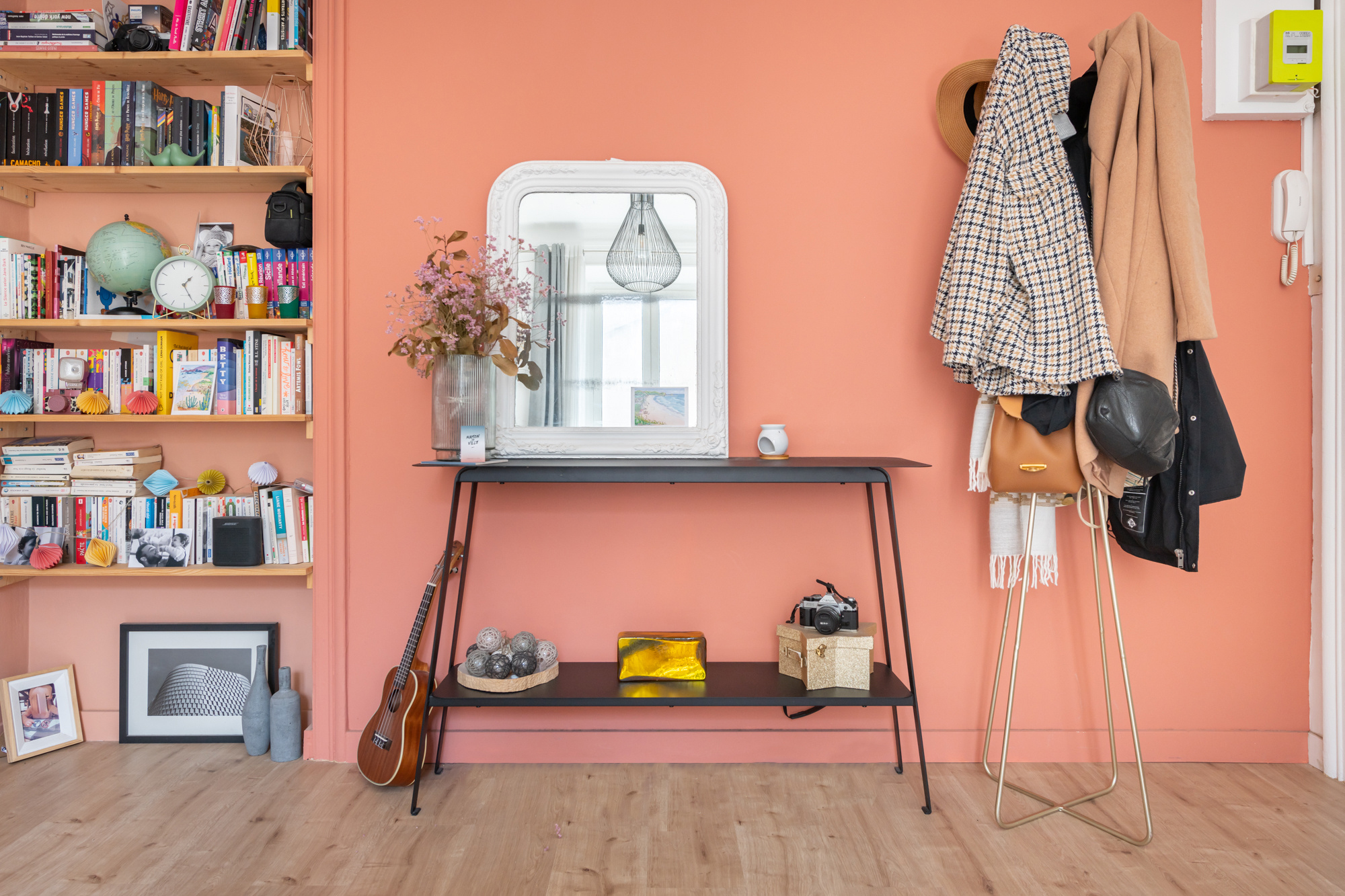 Le rose poudré choisi pour le mur d’entrée a apporté chaleur et personnalité à cet appartement. Le parquet a modernisé et a également apporté de la chaleur dans les pièces de vie. Les tomettes ont été conservées dans la chambre, seul endroit où elles étaient exploitables. La cuisine et la salle d’eau / WC ont été entièrement repensées de manière fonctionnelle et décorées par des jeux de textures et de teintes.