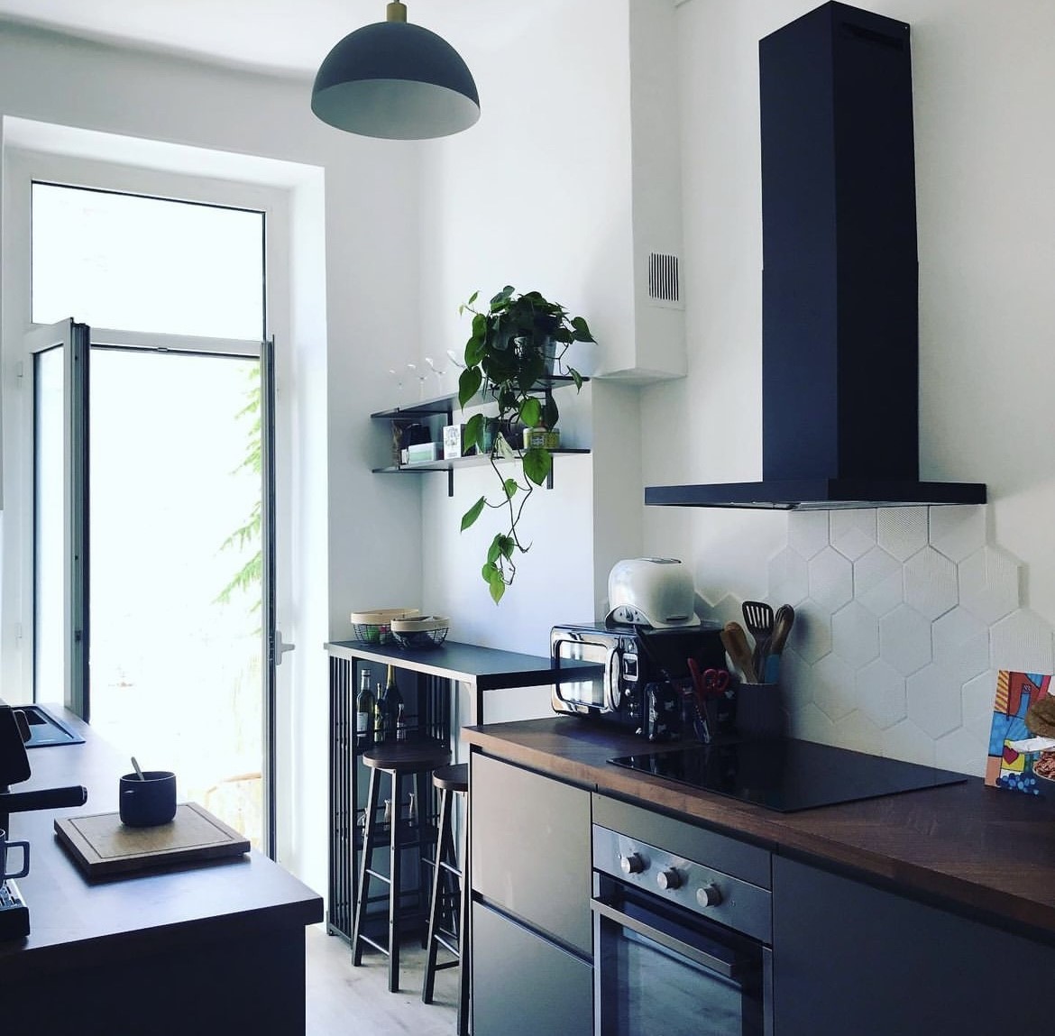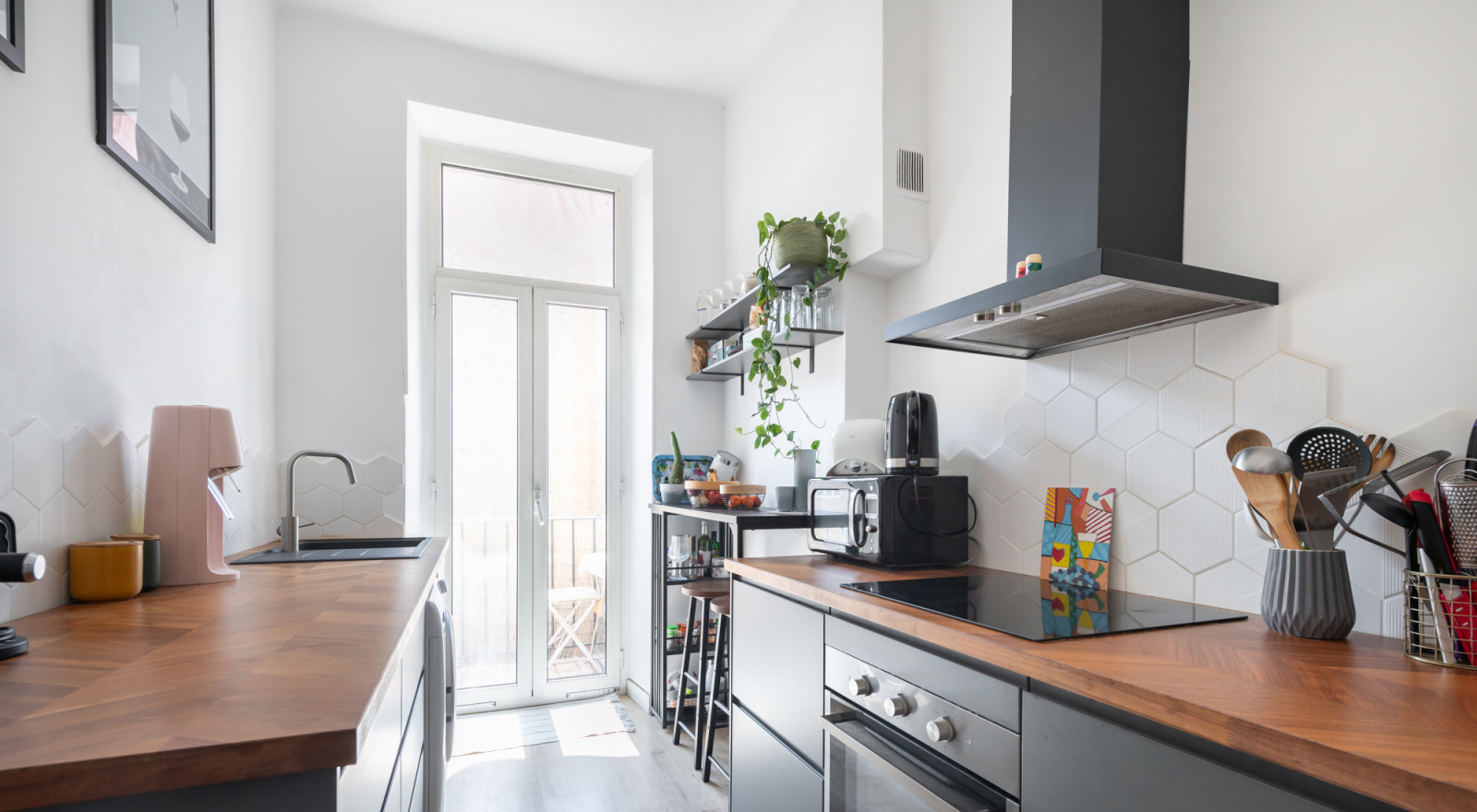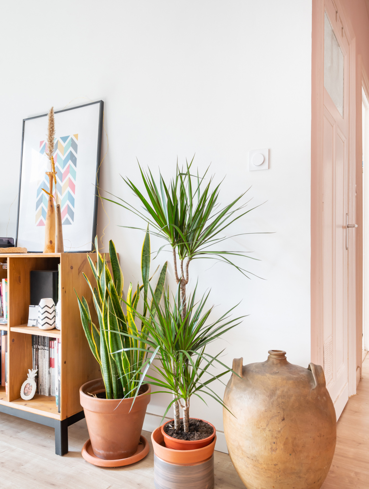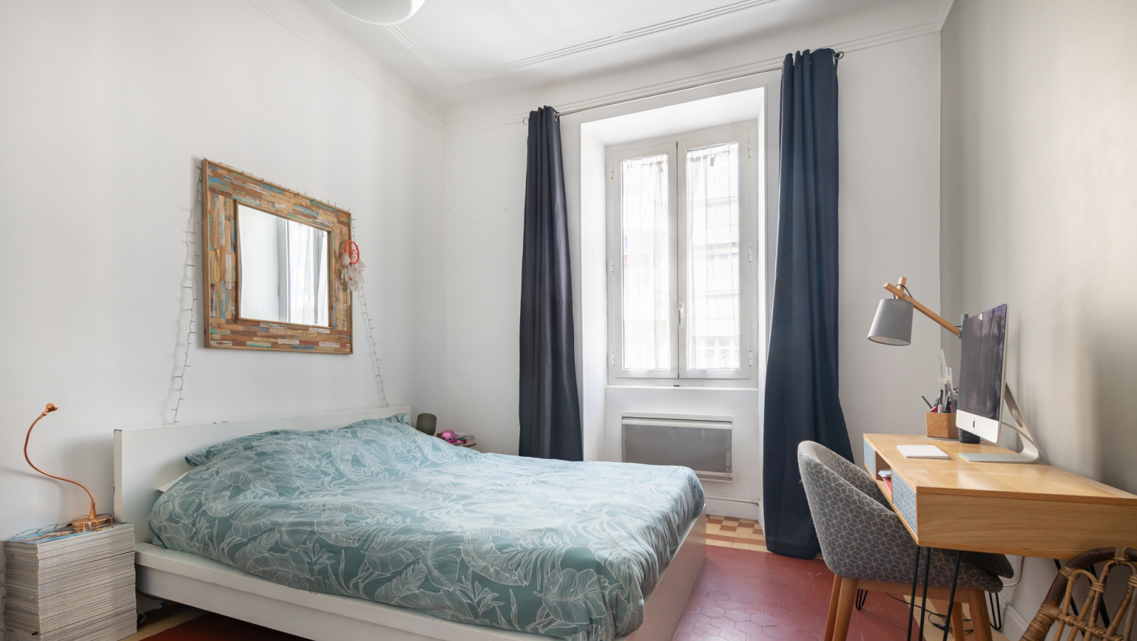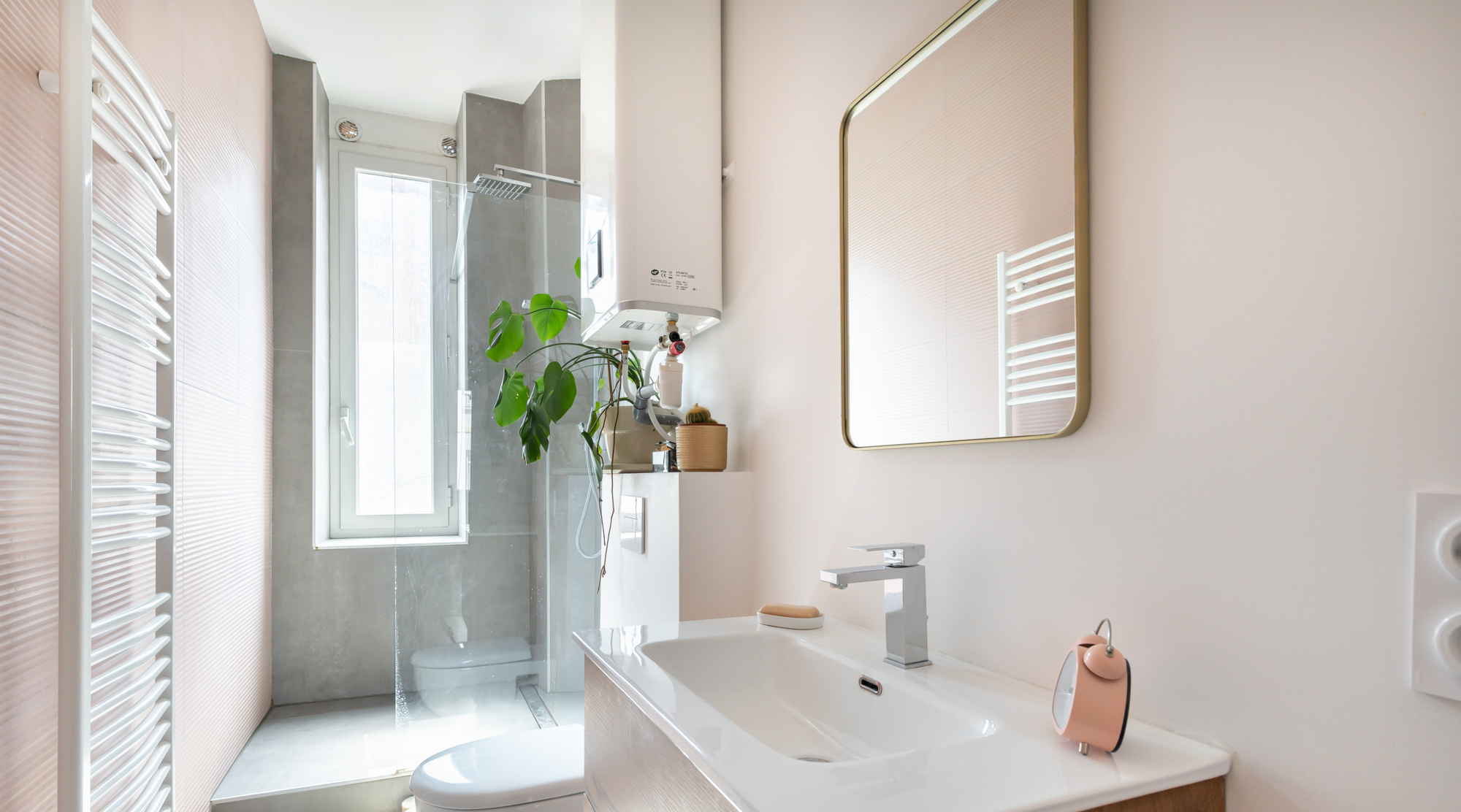 Le rose poudré choisi pour le mur d’entrée a apporté chaleur et personnalité à cet appartement. Le parquet a modernisé et a également apporté de la chaleur dans les pièces de vie. Les tomettes ont été conservées dans la chambre, seul endroit où elles étaient exploitables. La cuisine et la salle d’eau / WC ont été entièrement repensées de manière fonctionnelle et décorées par des jeux de textures et de teintes.