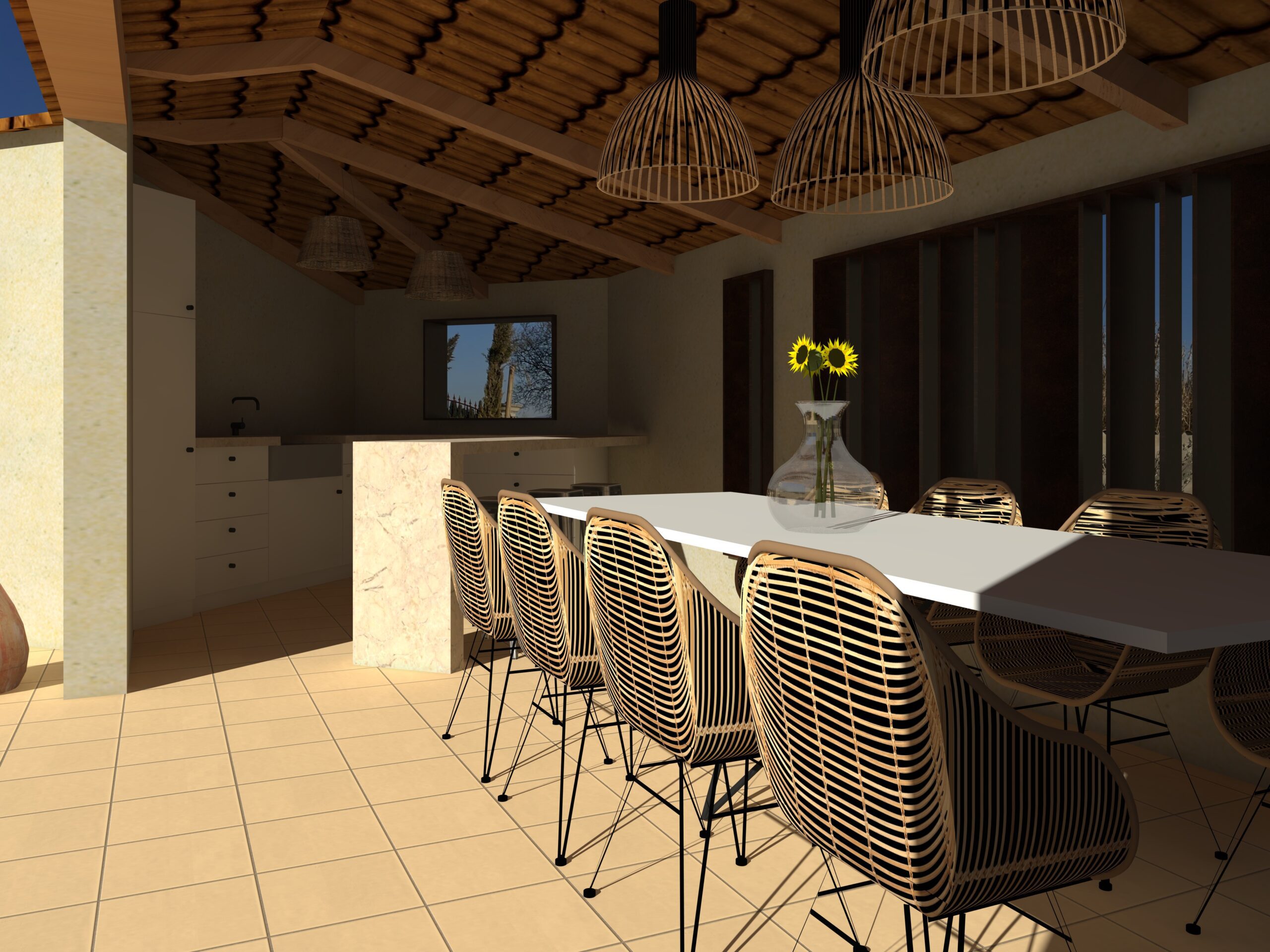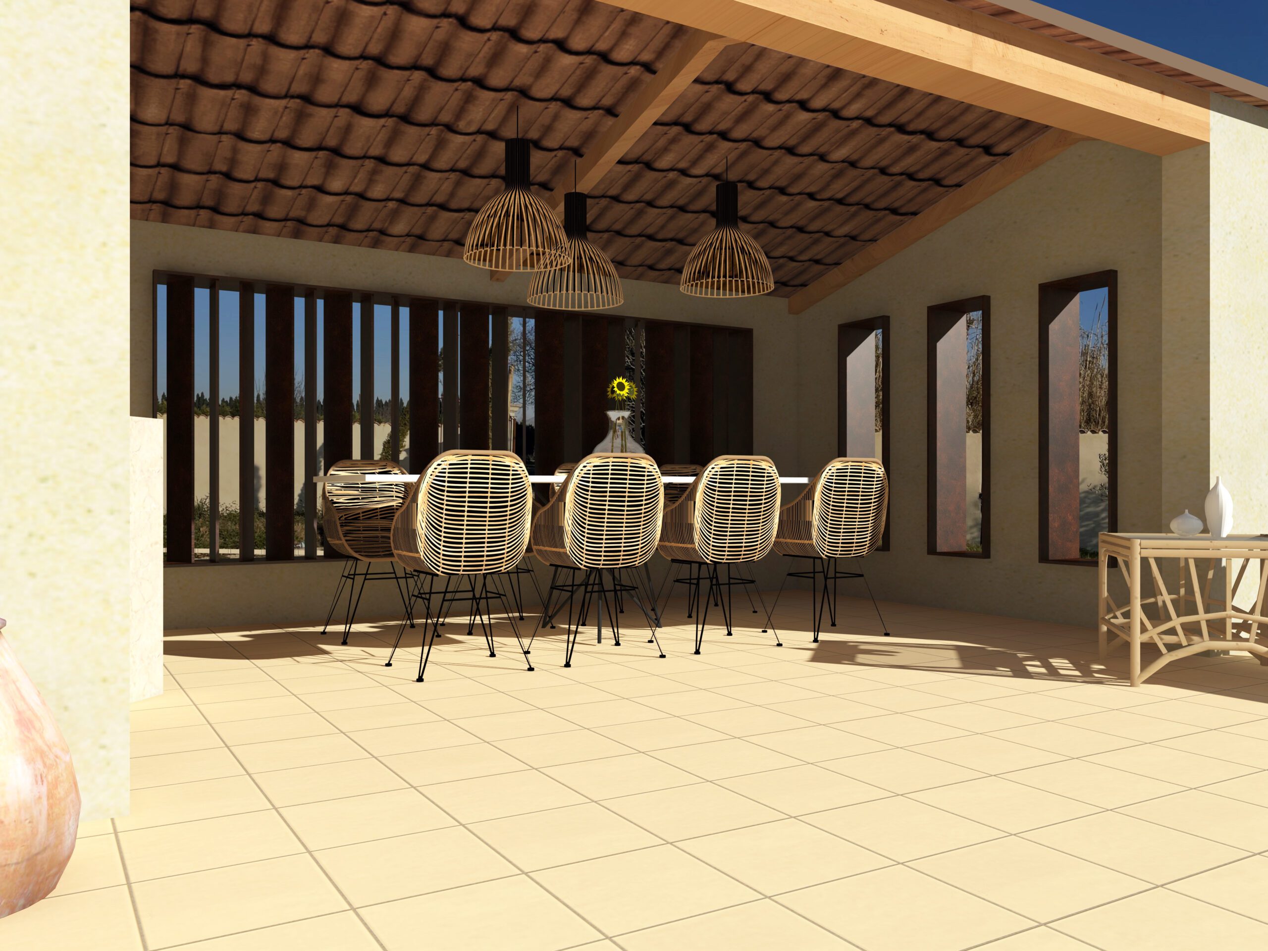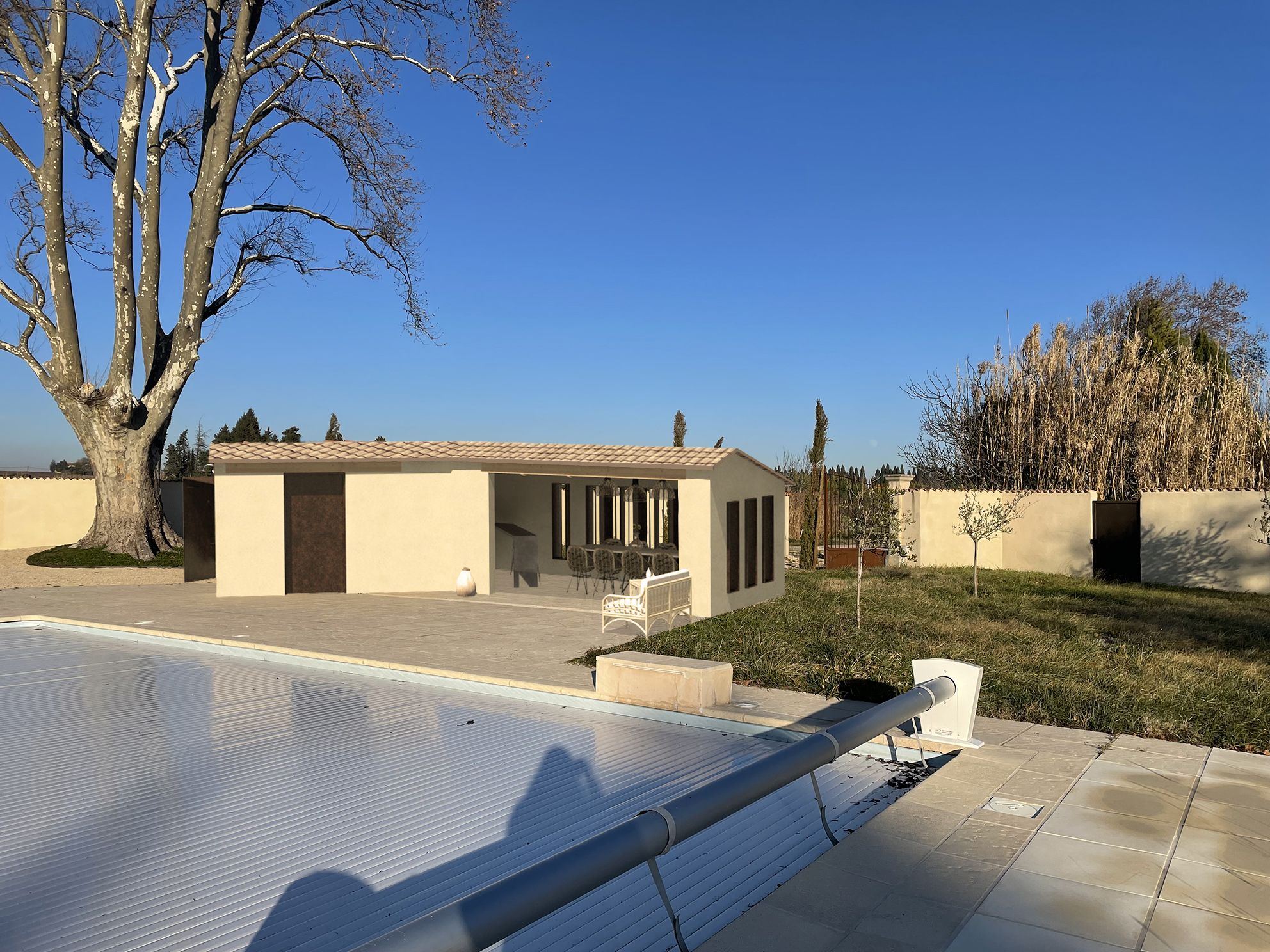 Le projet consiste en la création d’un poolhouse. Cet espace, entre l’intérieur et l’extérieur, dans le prolongement du local technique de la piscine, abrite une cuisine d’été et un salon de jardin couverts. Il reprend les codes de la construction traditionnelle : maçonnerie traditionnelle, enduit teinte sable, charpente bois et tuiles rondes. La composition des façades au moyen de fentes à claire-voie et de pare-soleil en acier de type corten ajoutent un aspect contemporain.