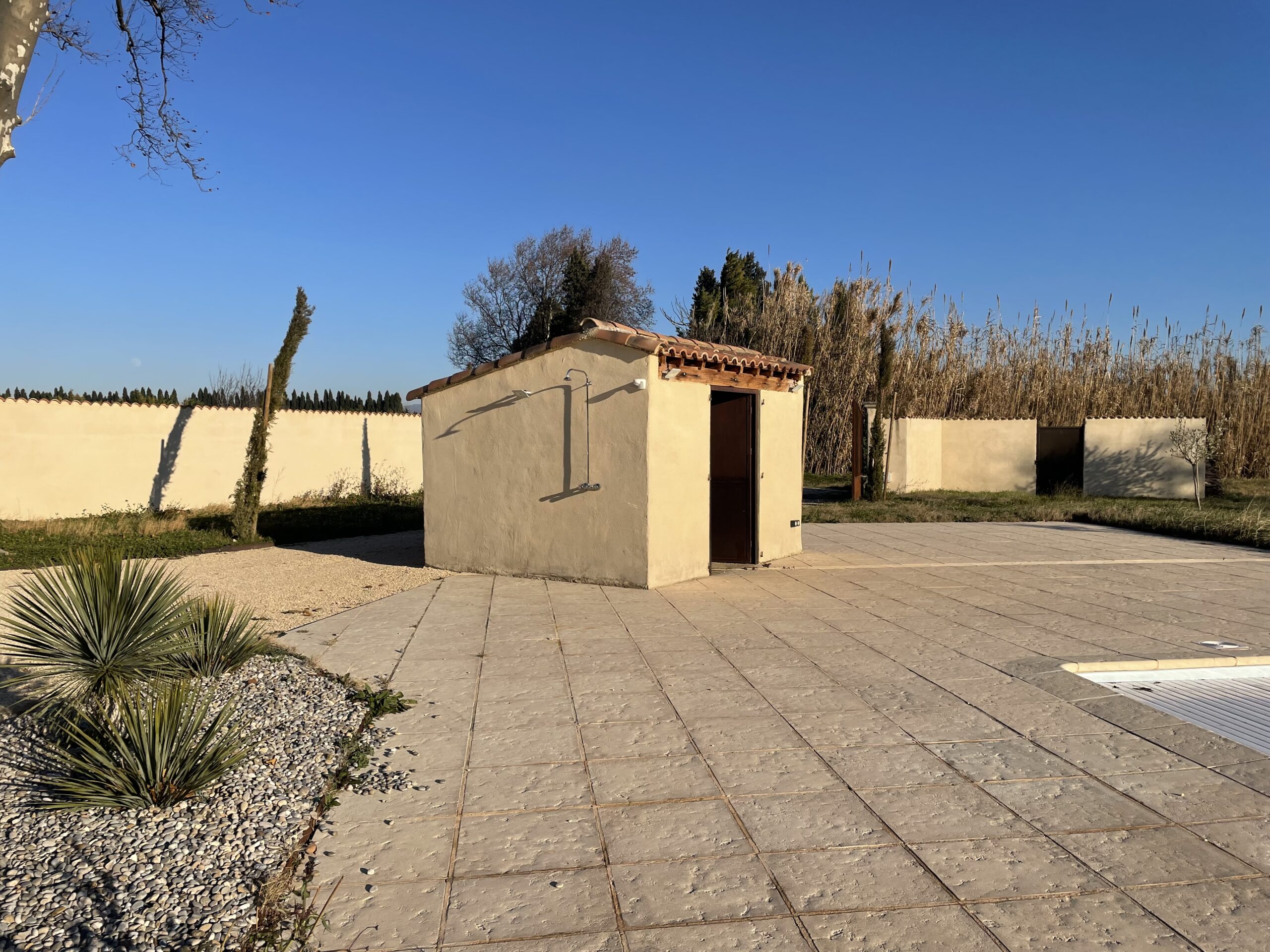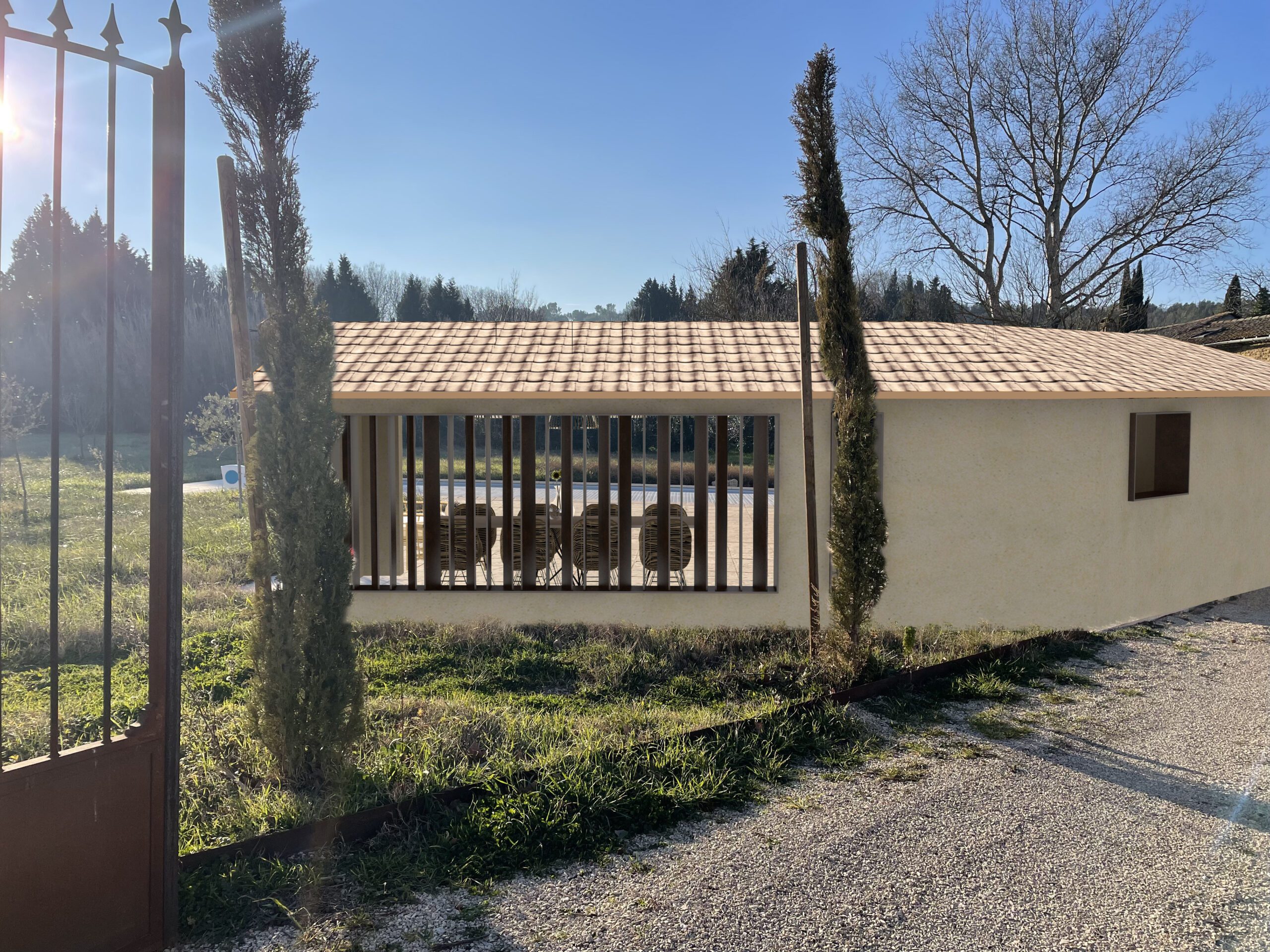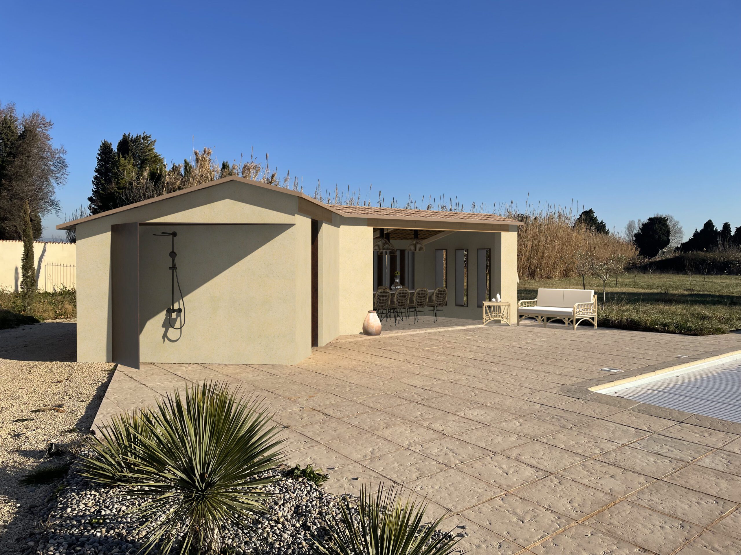 Le projet consiste en la création d’un poolhouse. Cet espace, entre l’intérieur et l’extérieur, dans le prolongement du local technique de la piscine, abrite une cuisine d’été et un salon de jardin couverts. Il reprend les codes de la construction traditionnelle : maçonnerie traditionnelle, enduit teinte sable, charpente bois et tuiles rondes. La composition des façades au moyen de fentes à claire-voie et de pare-soleil en acier de type corten ajoutent un aspect contemporain.