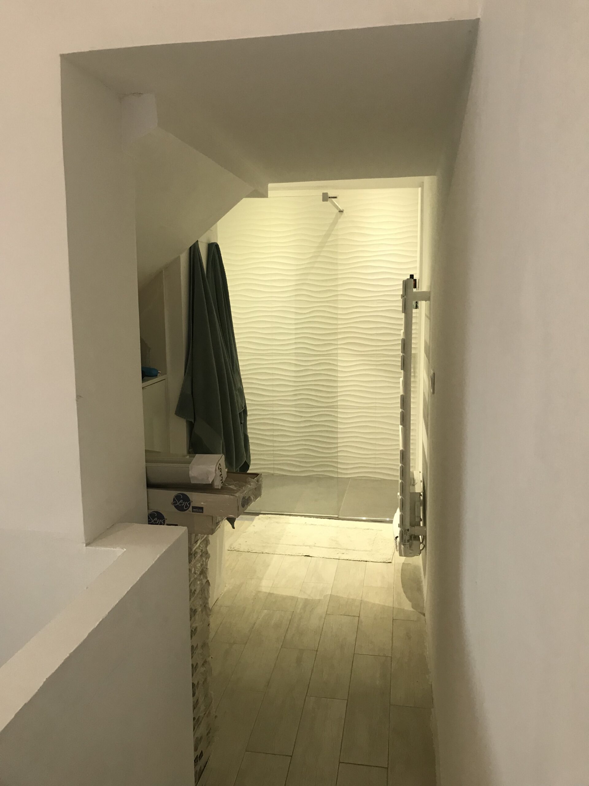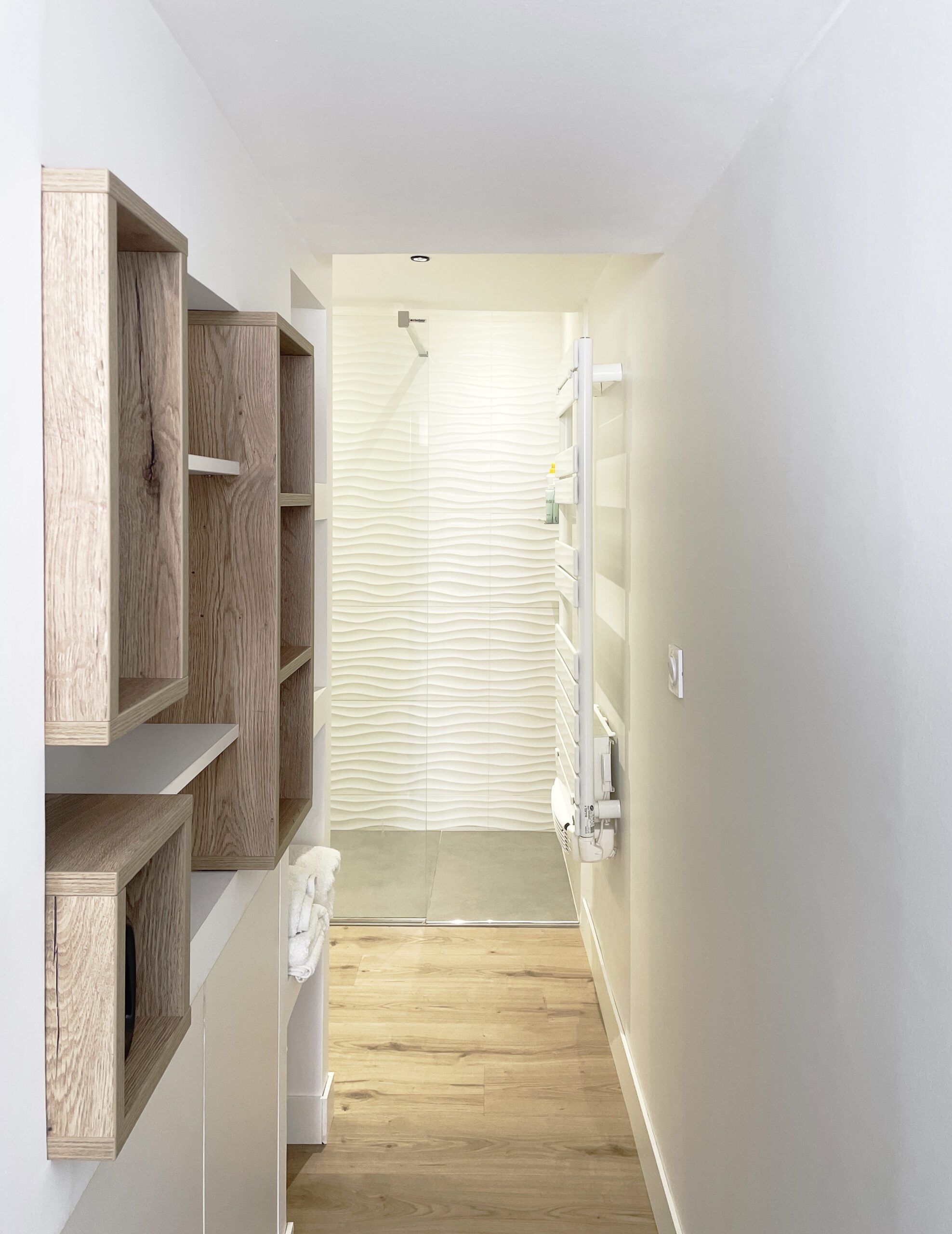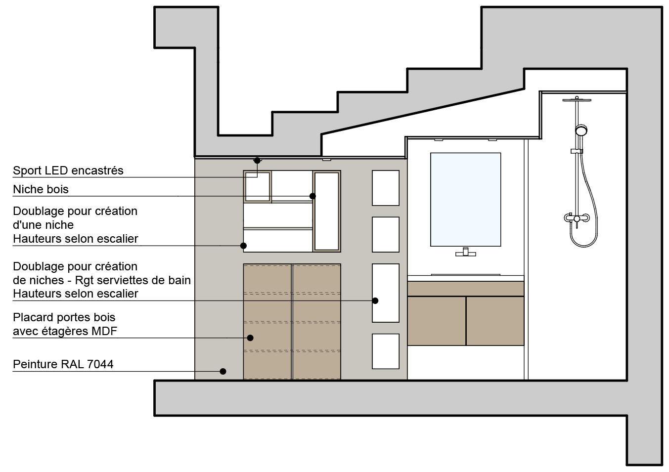 L’accès à la salle de bain n’offre maintenant plus de vue sur le dessous de l’escalier mais donne accès à divers rangements, niches et placards, aux matières et formes dynamiques.