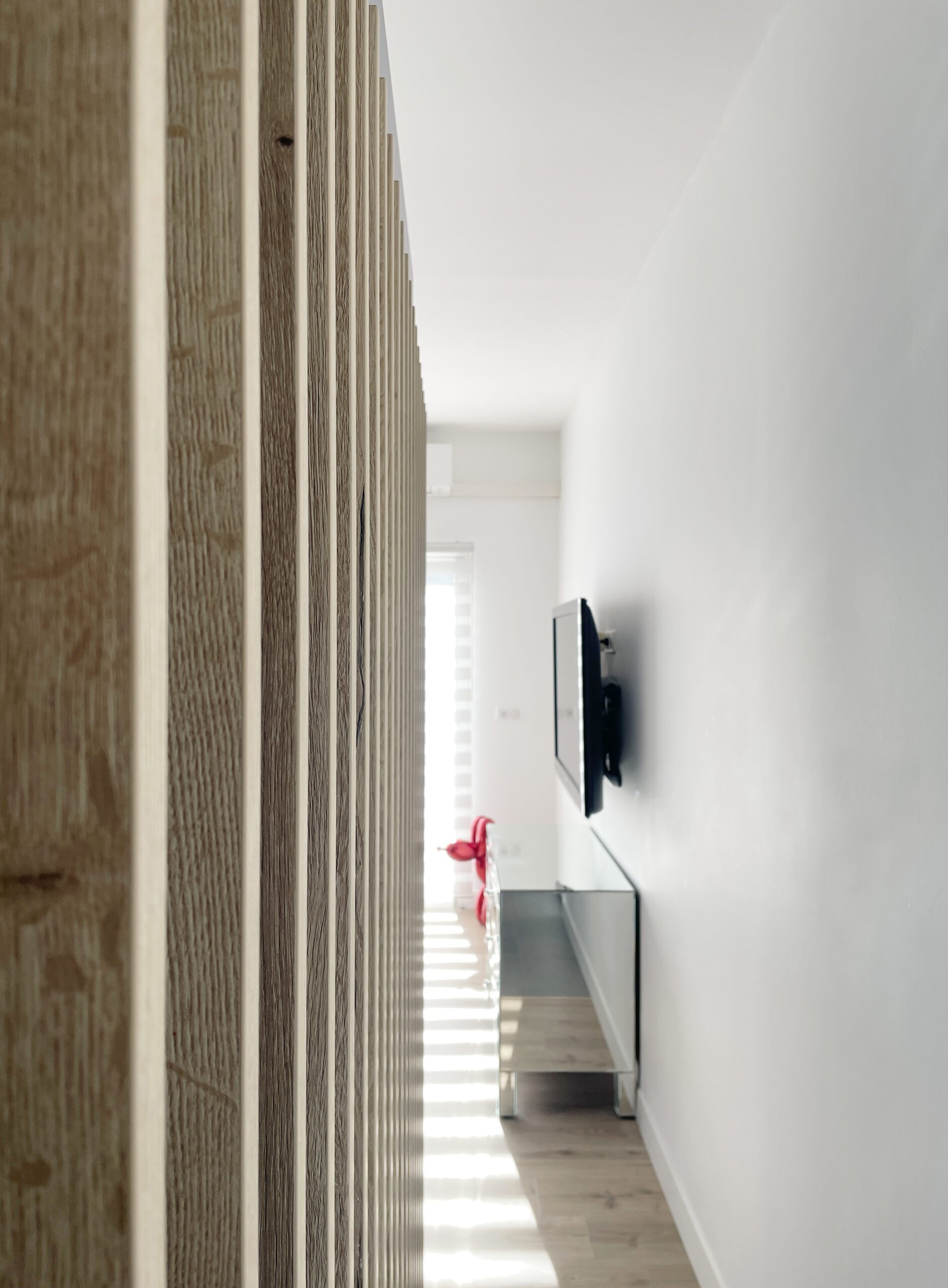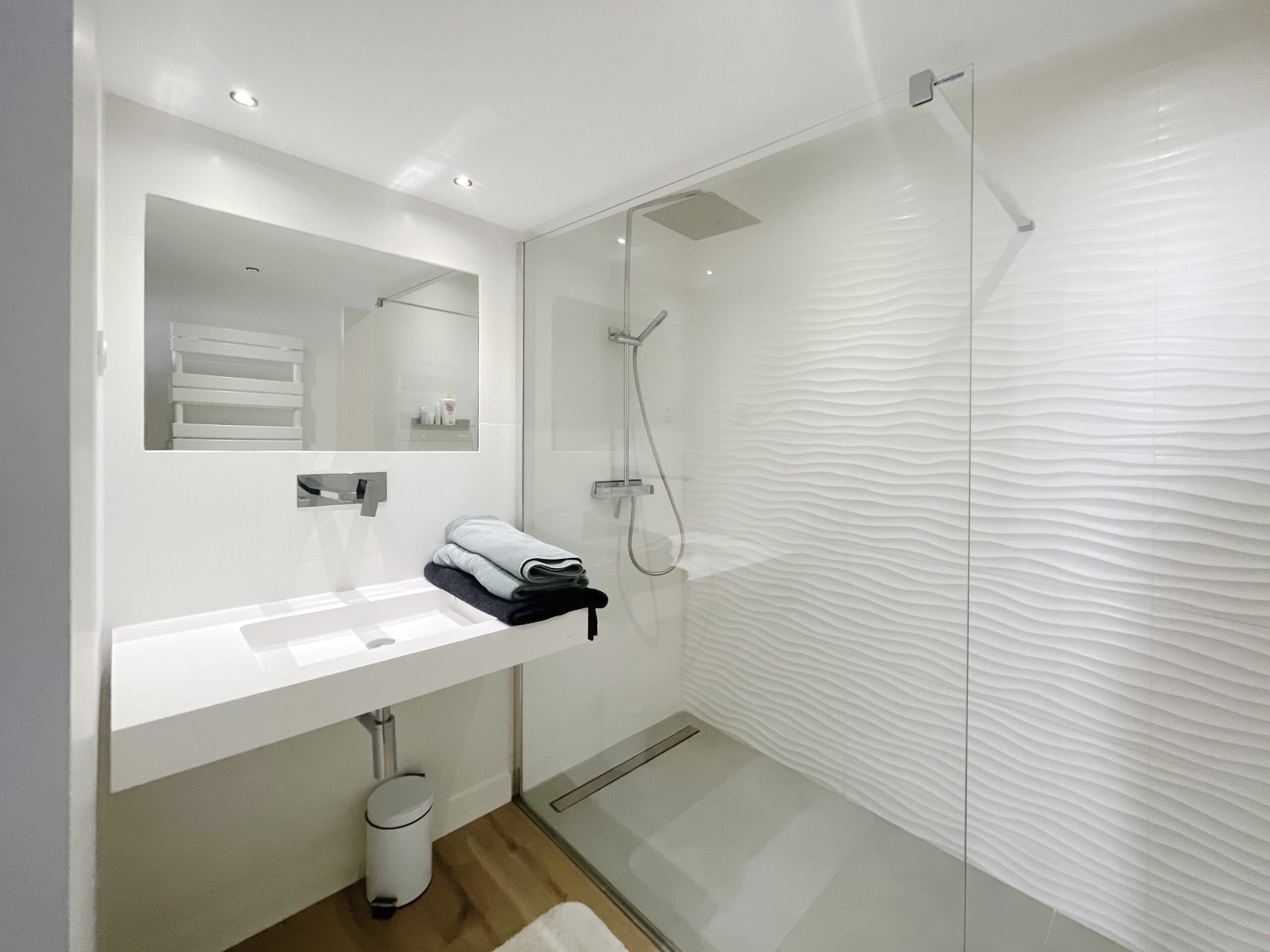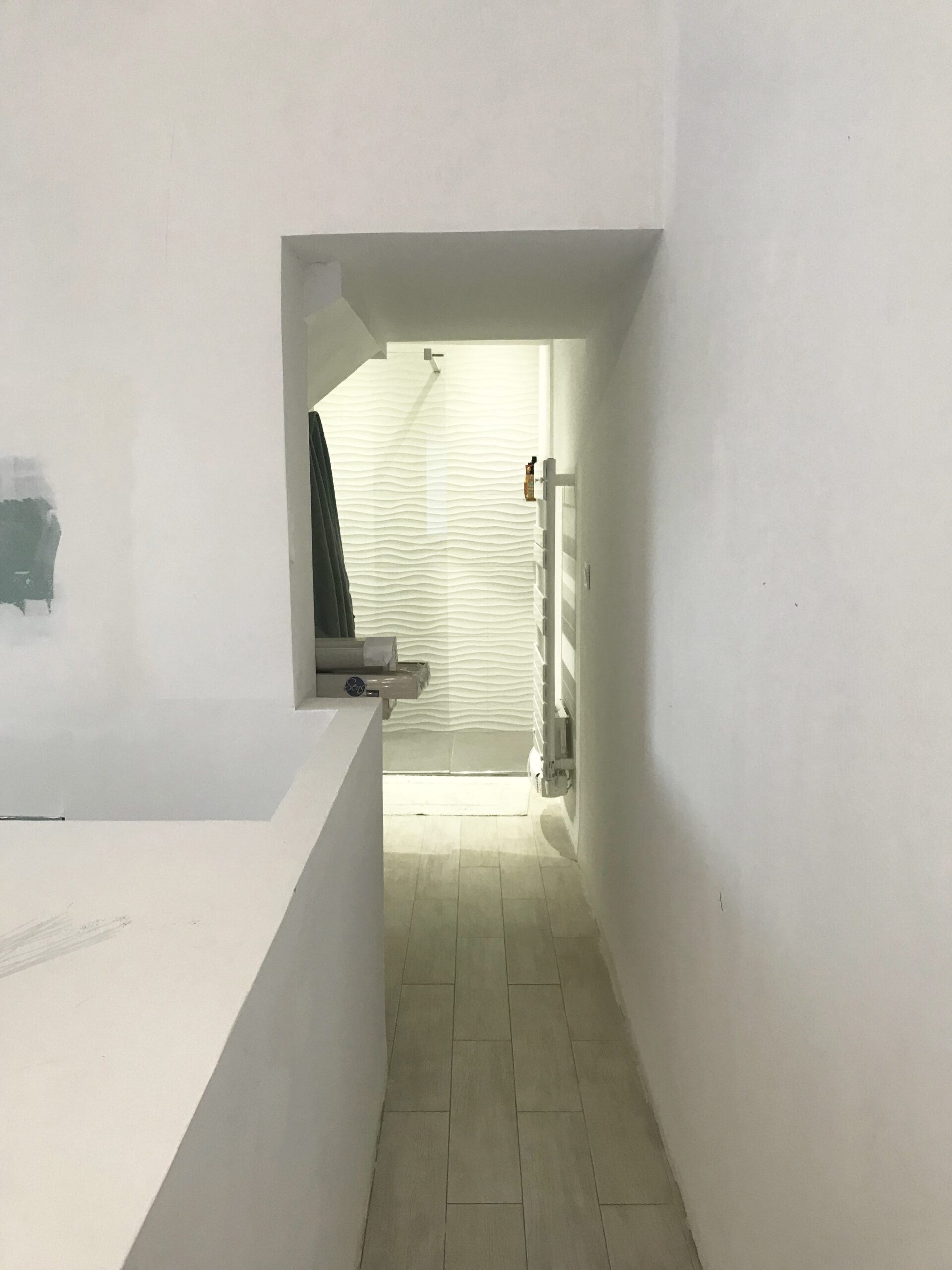L’accès à la salle de bain n’offre maintenant plus de vue sur le dessous de l’escalier mais donne accès à divers rangements, niches et placards, aux matières et formes dynamiques.