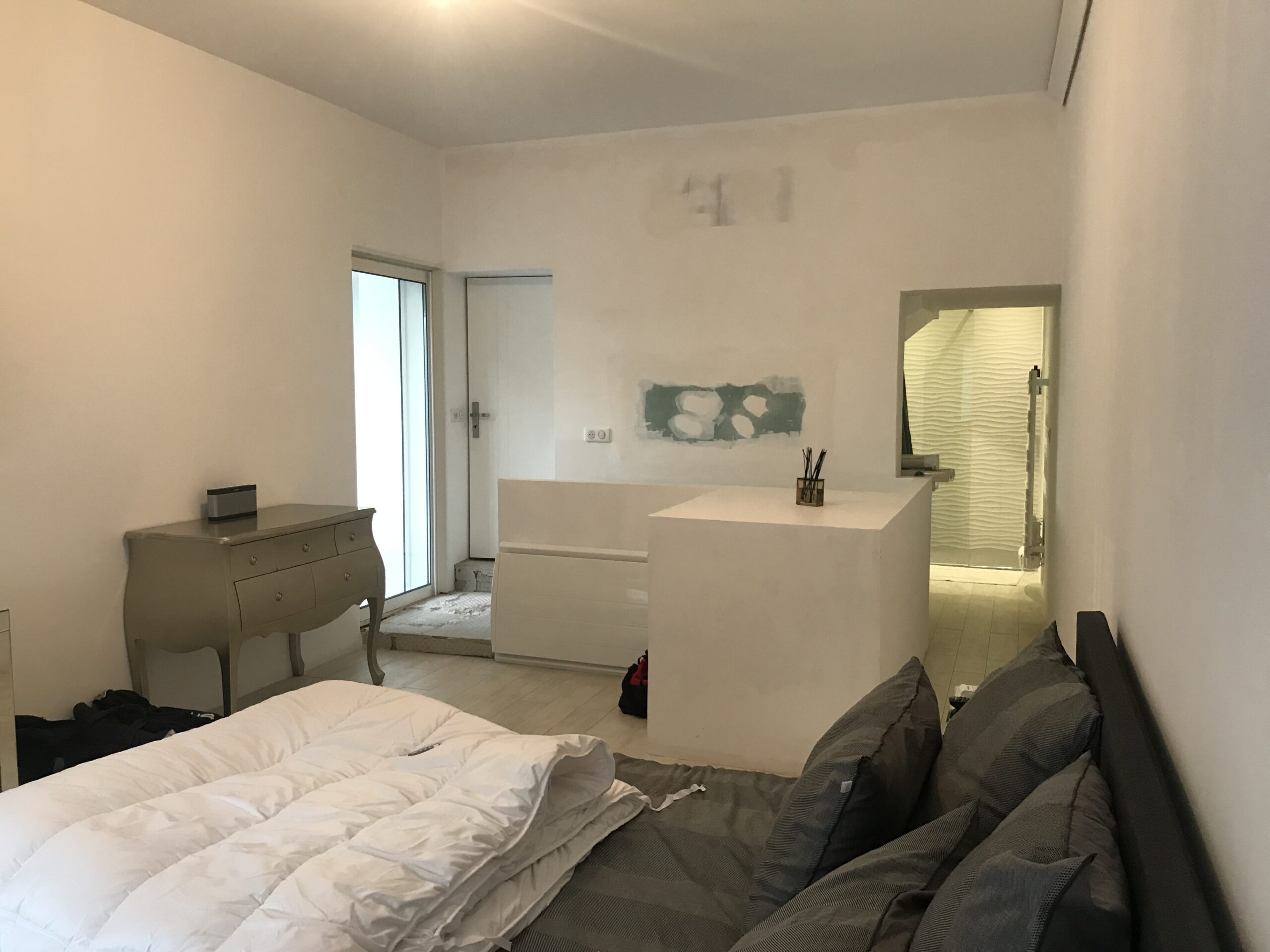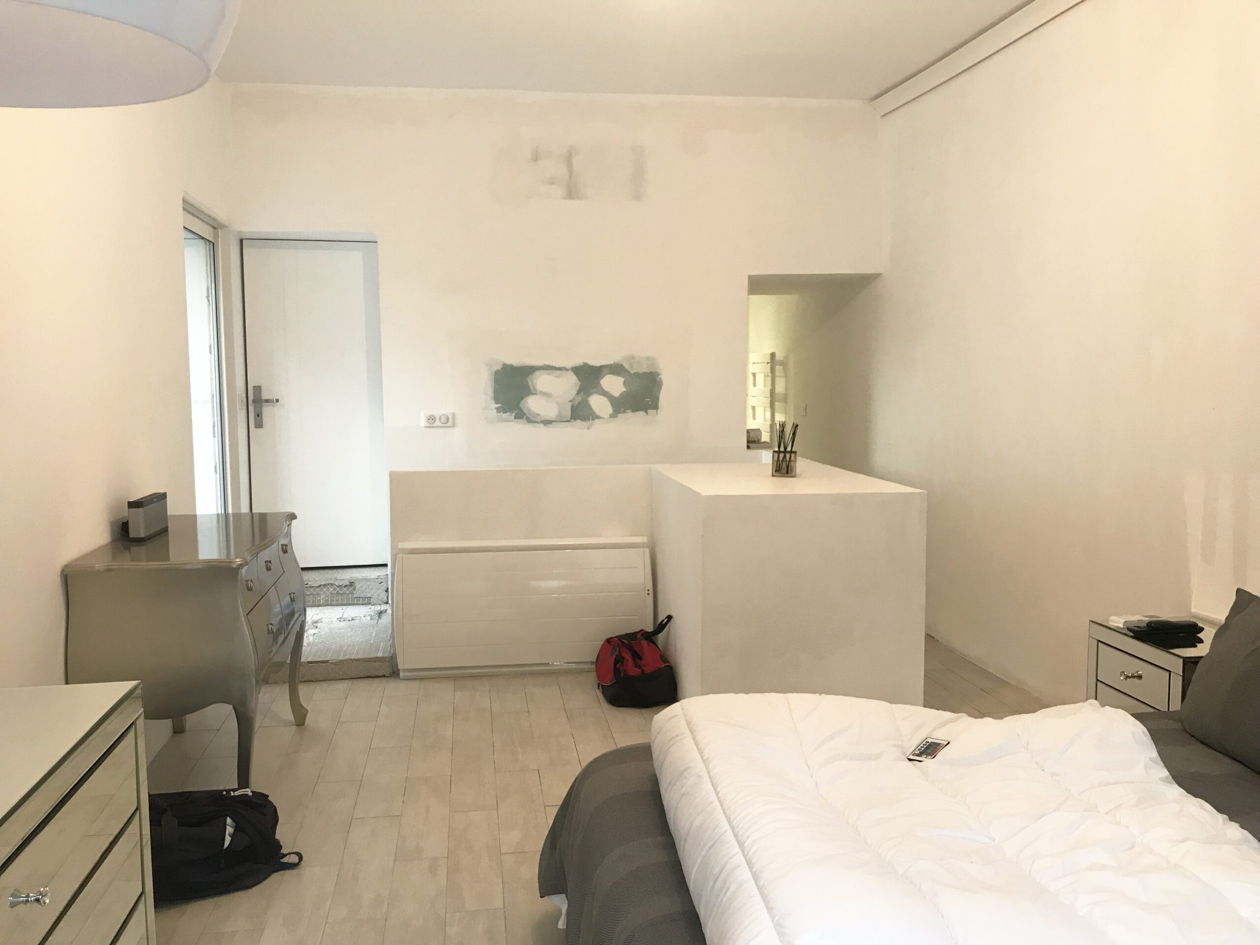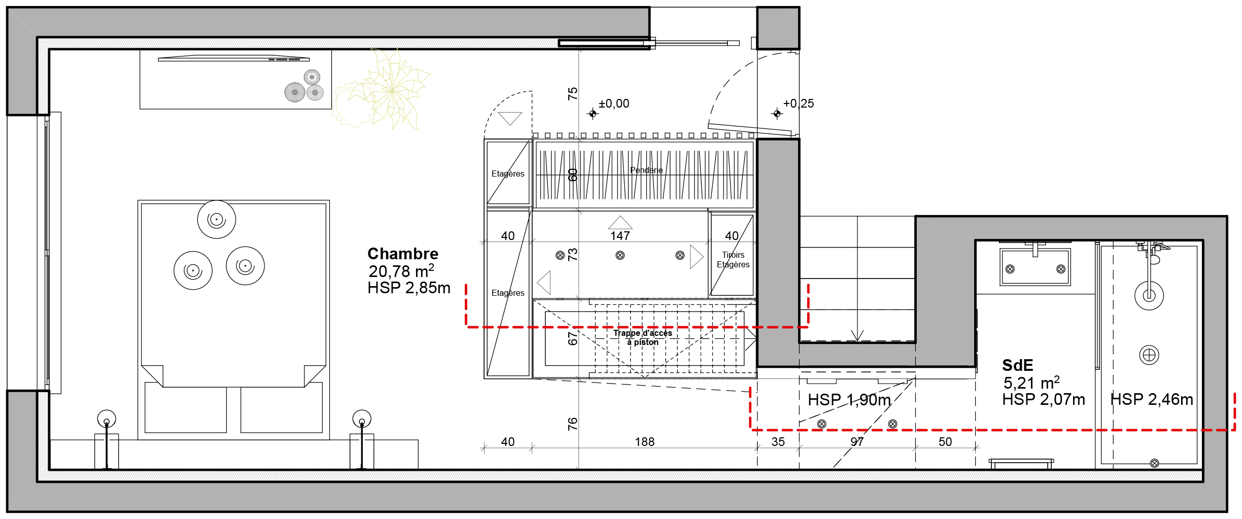 La difficulté de ce projet résidait dans la volonté du client d’aménager un accès au sous-sol de la maison depuis la chambre, de masquer l’édicule d’accès, d’avoir un dressing aux dimensions confortables et d’habiller le passage de l’espace nuit vers la salle de bain.