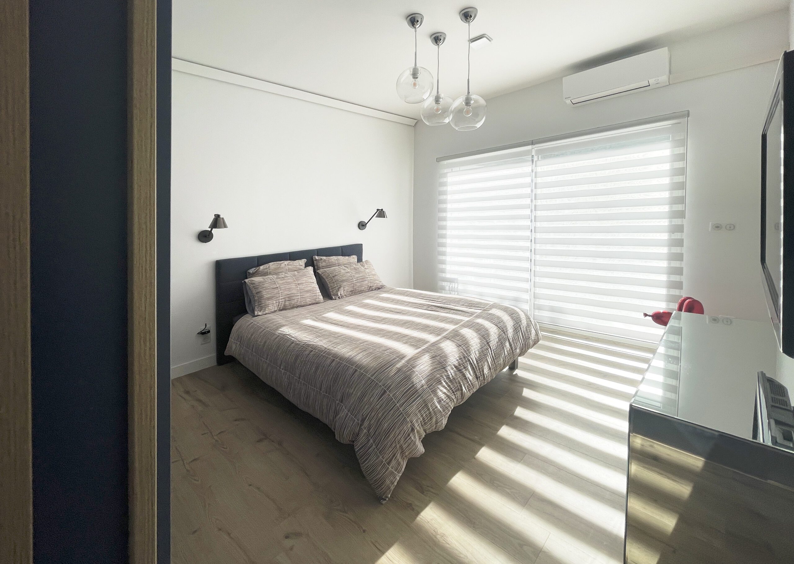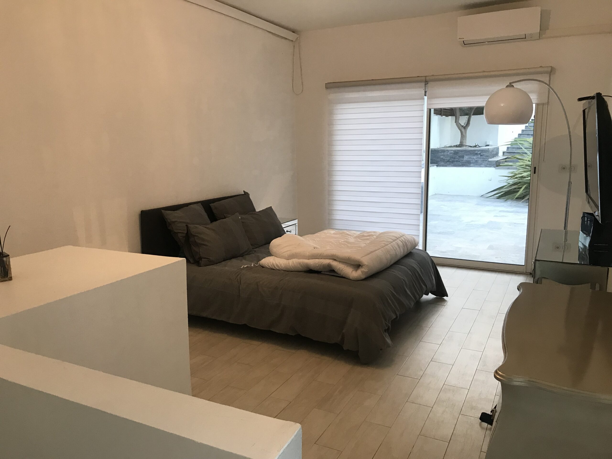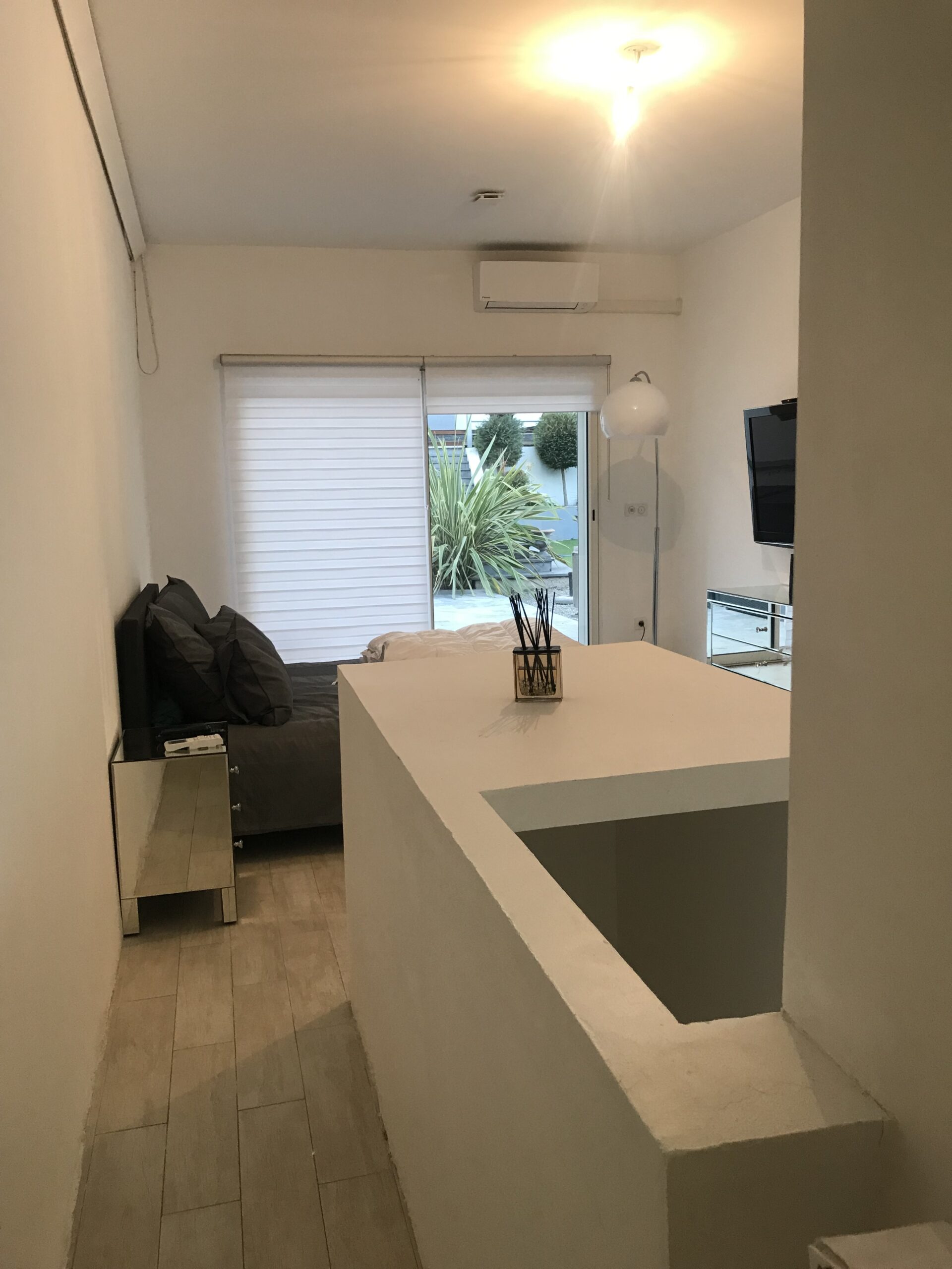 La difficulté de ce projet résidait dans la volonté du client d’aménager un accès au sous-sol de la maison depuis la chambre, de masquer l’édicule d’accès, d’avoir un dressing aux dimensions confortables et d’habiller le passage de l’espace nuit vers la salle de bain.