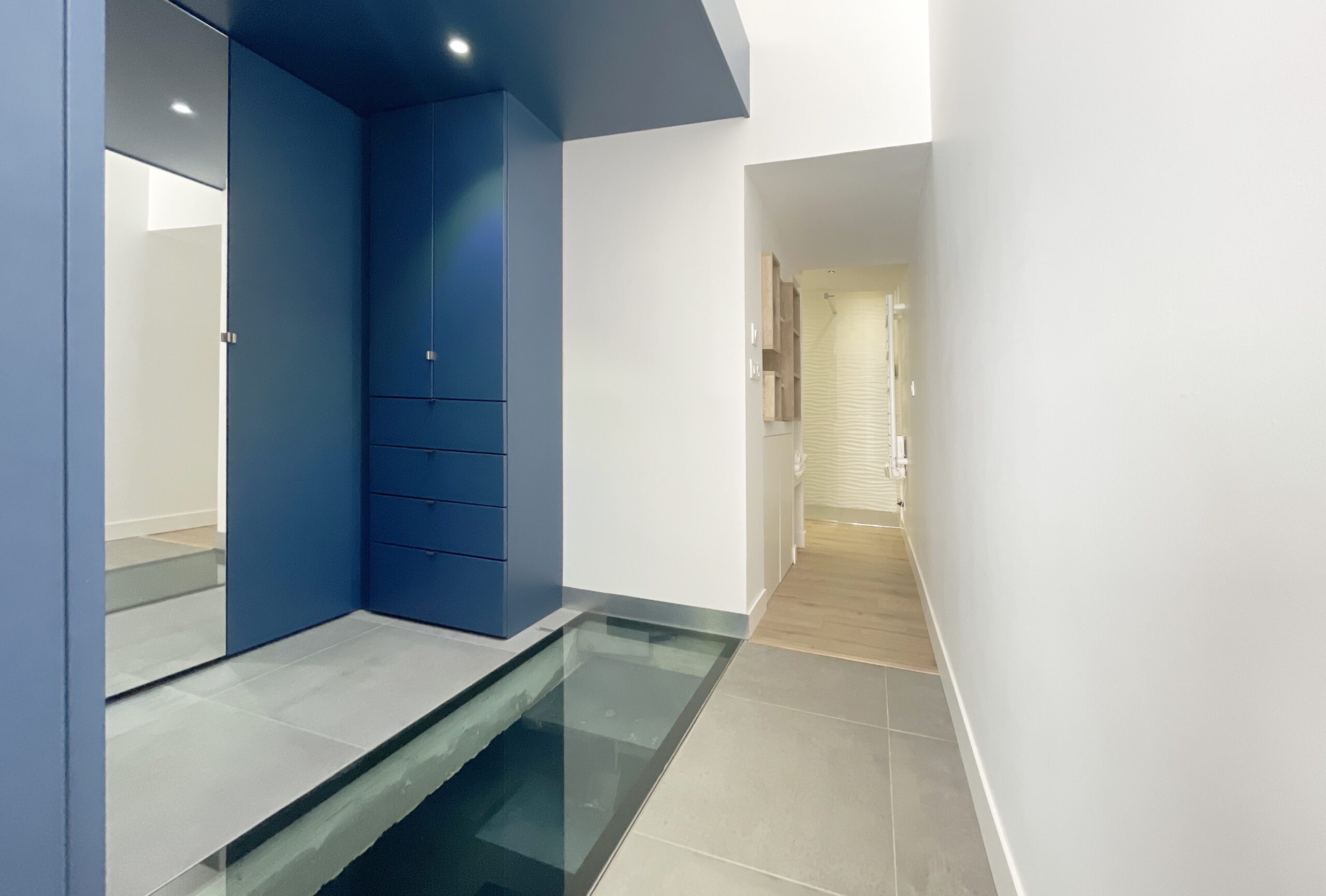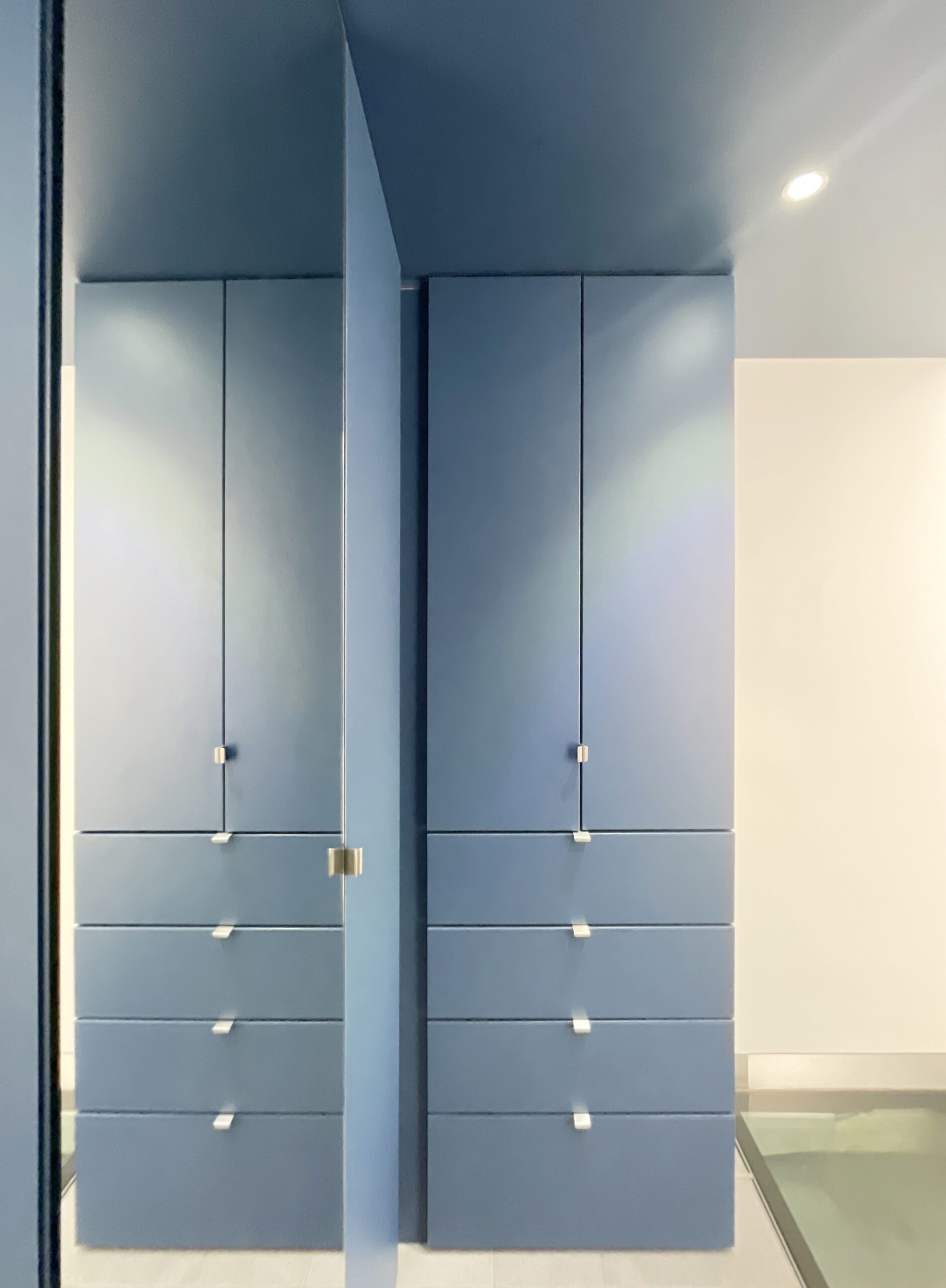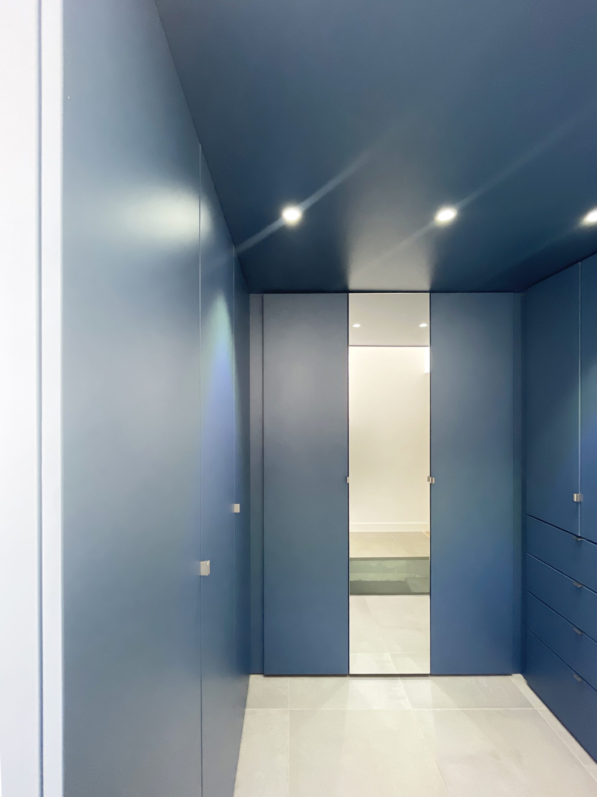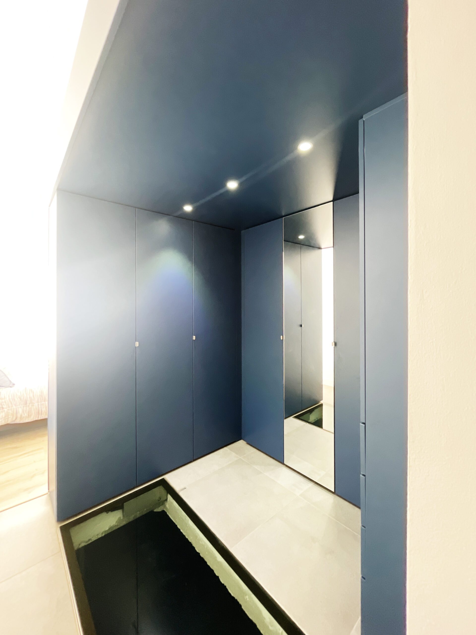Il a alors été dessiné et conçu une « boîte bleue » menuisée. Cet élément aux multiples rangements offre un dressing complet, éclairé par 3 spots encastrés, intégrant l’édicule d’accès au sous-sol.