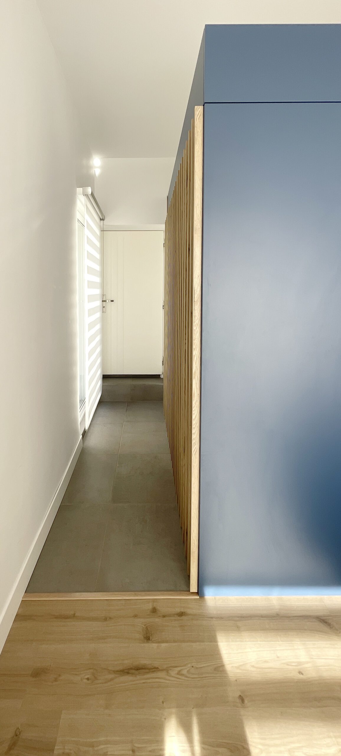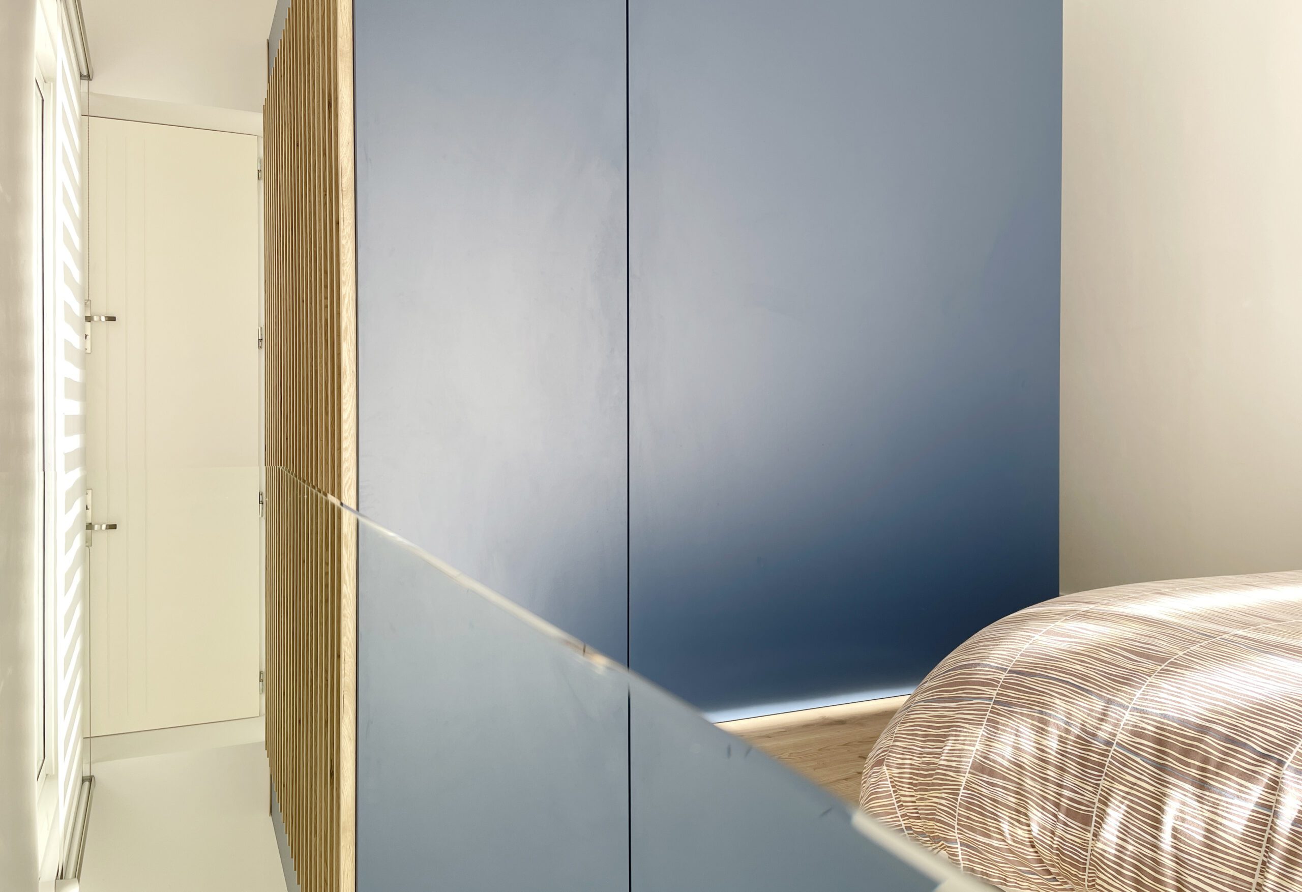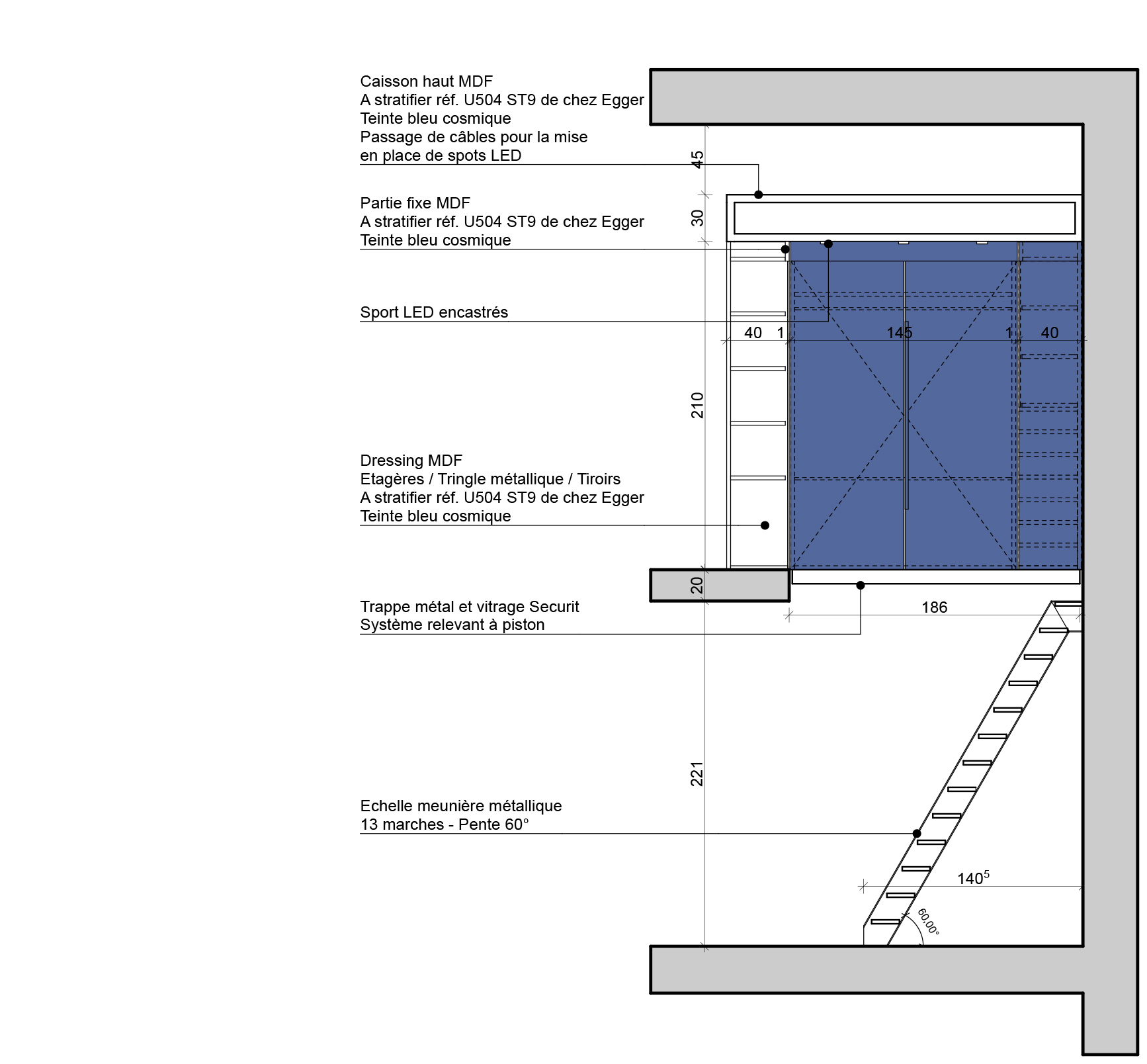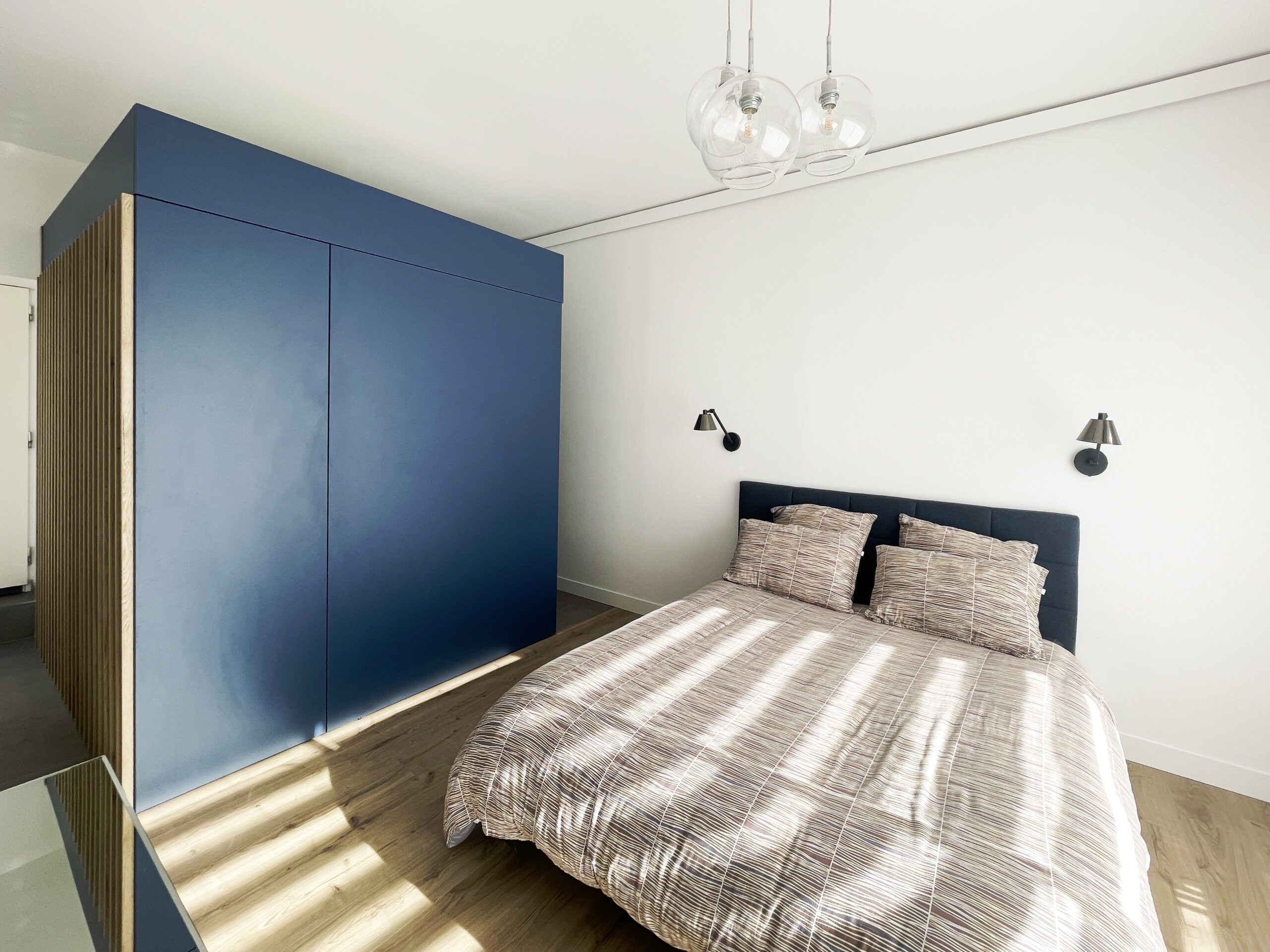 Il a alors été dessiné et conçu une « boîte bleue » menuisée. Cet élément aux multiples rangements offre un dressing complet, éclairé par 3 spots encastrés, intégrant l’édicule d’accès au sous-sol.