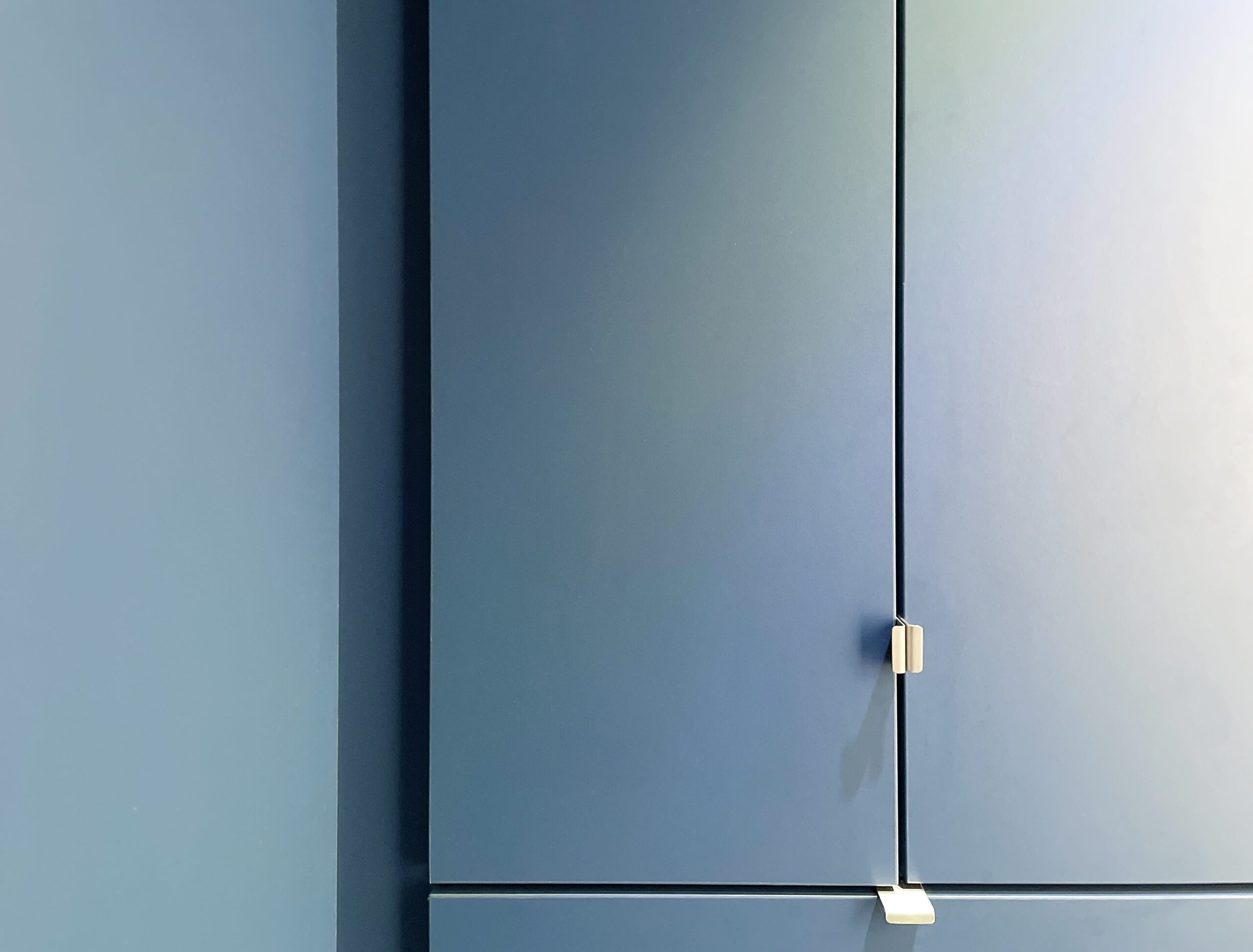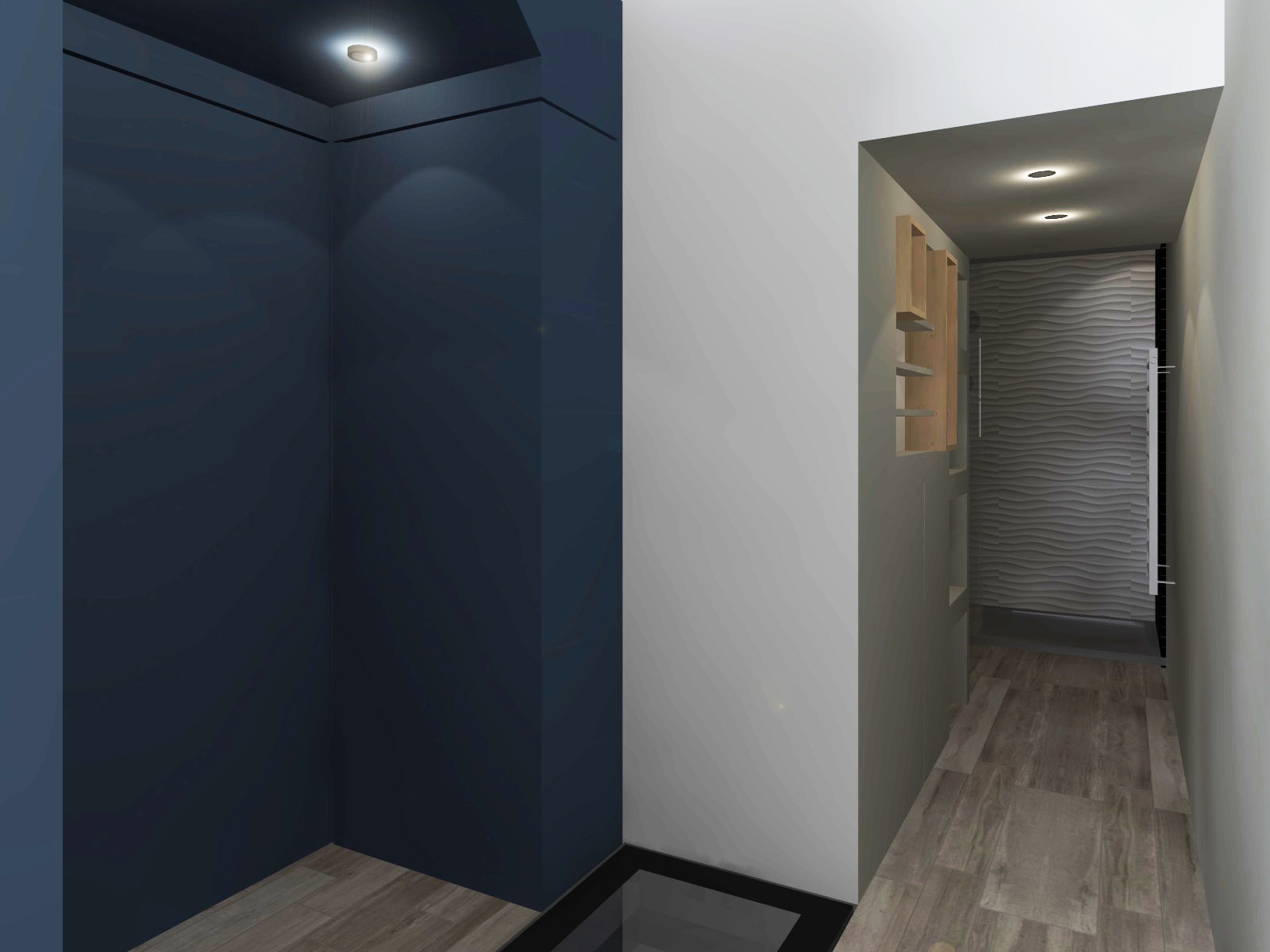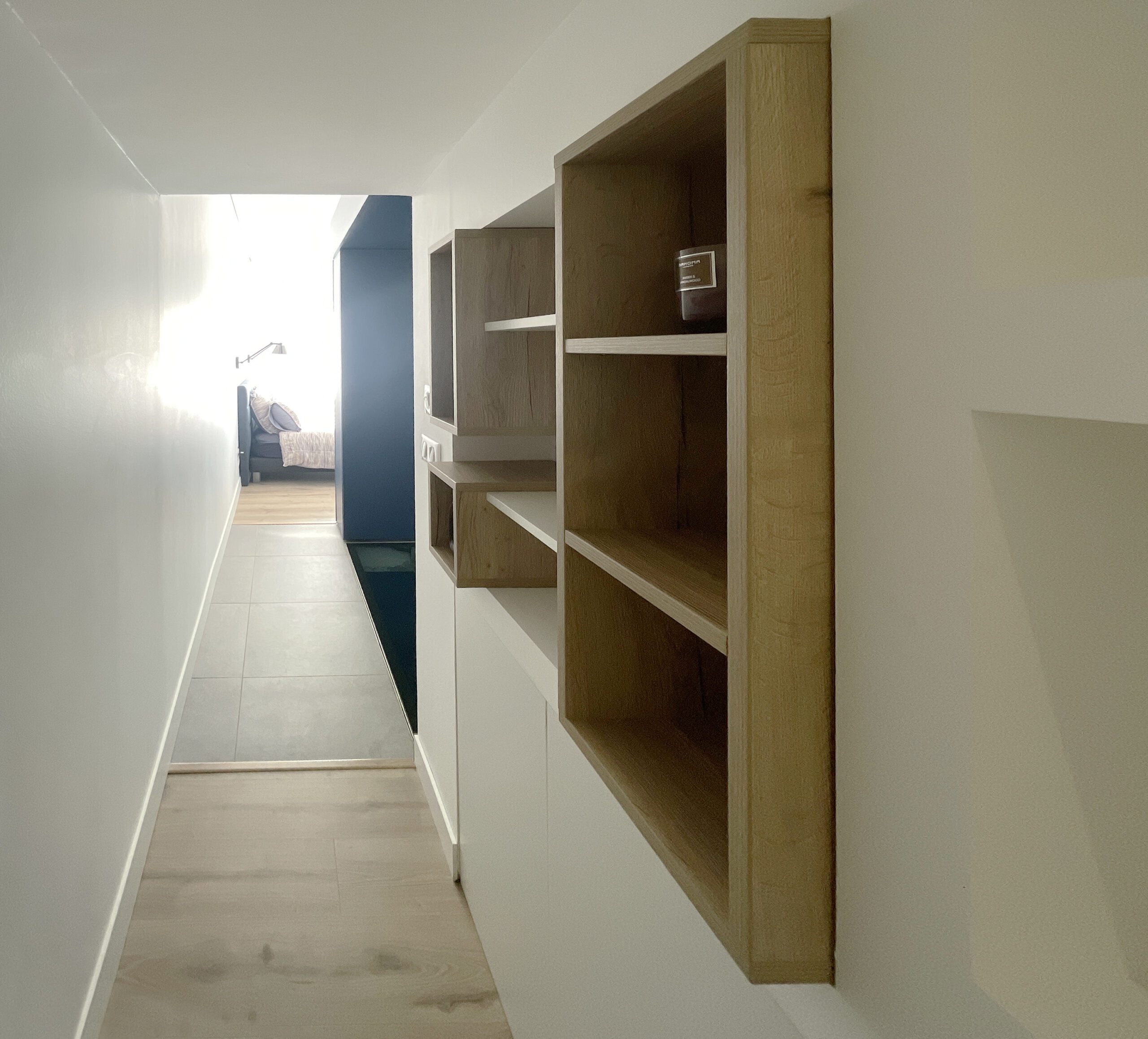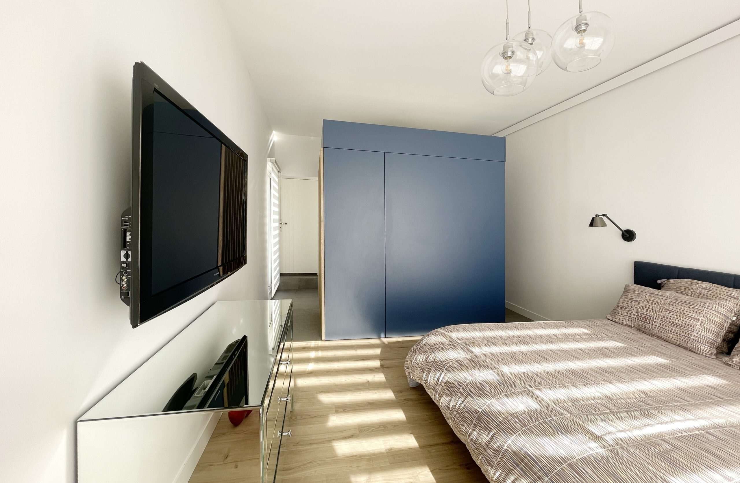 Il a alors été dessiné et conçu une « boîte bleue » menuisée. Cet élément aux multiples rangements offre un dressing complet, éclairé par 3 spots encastrés, intégrant l’édicule d’accès au sous-sol.