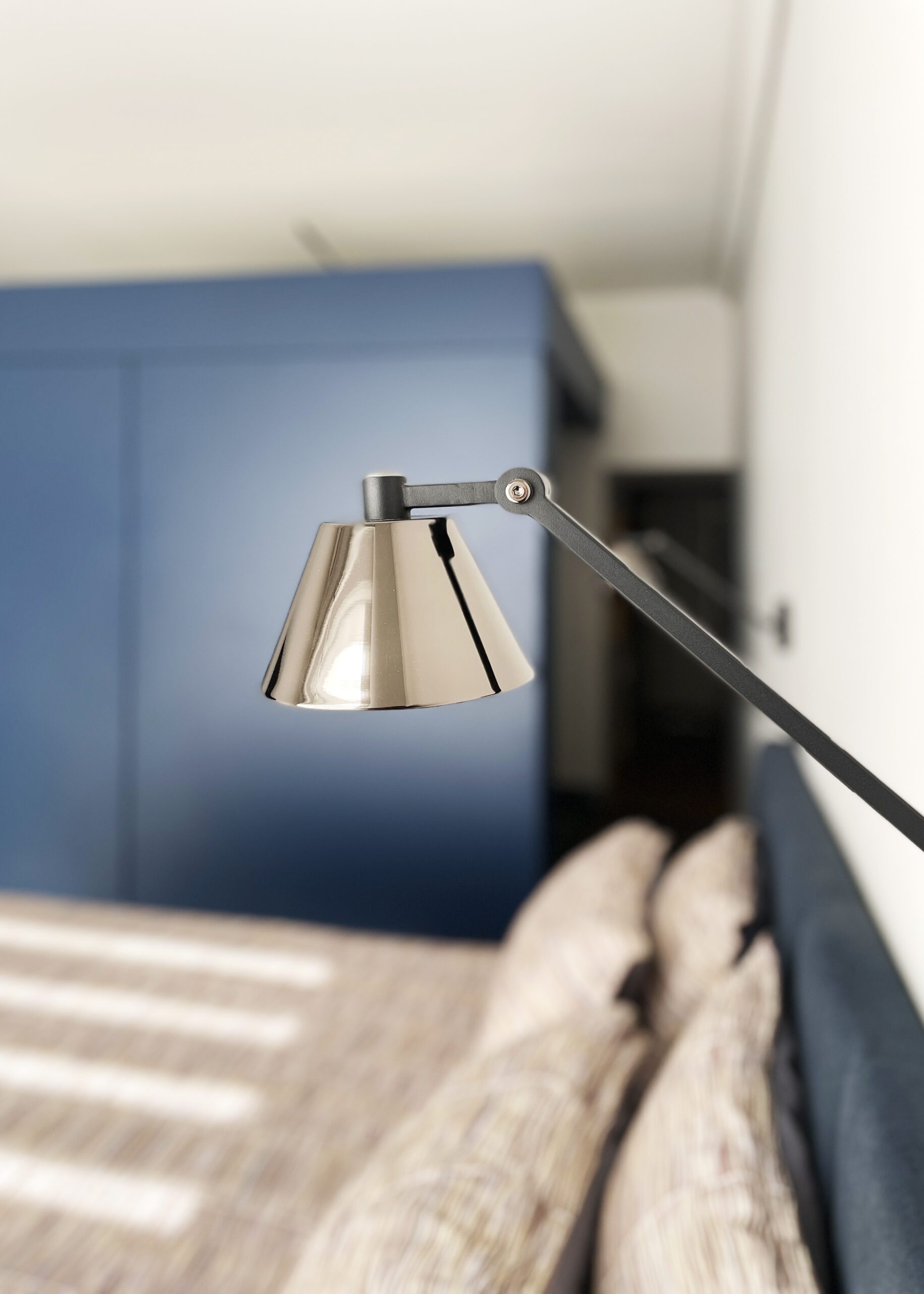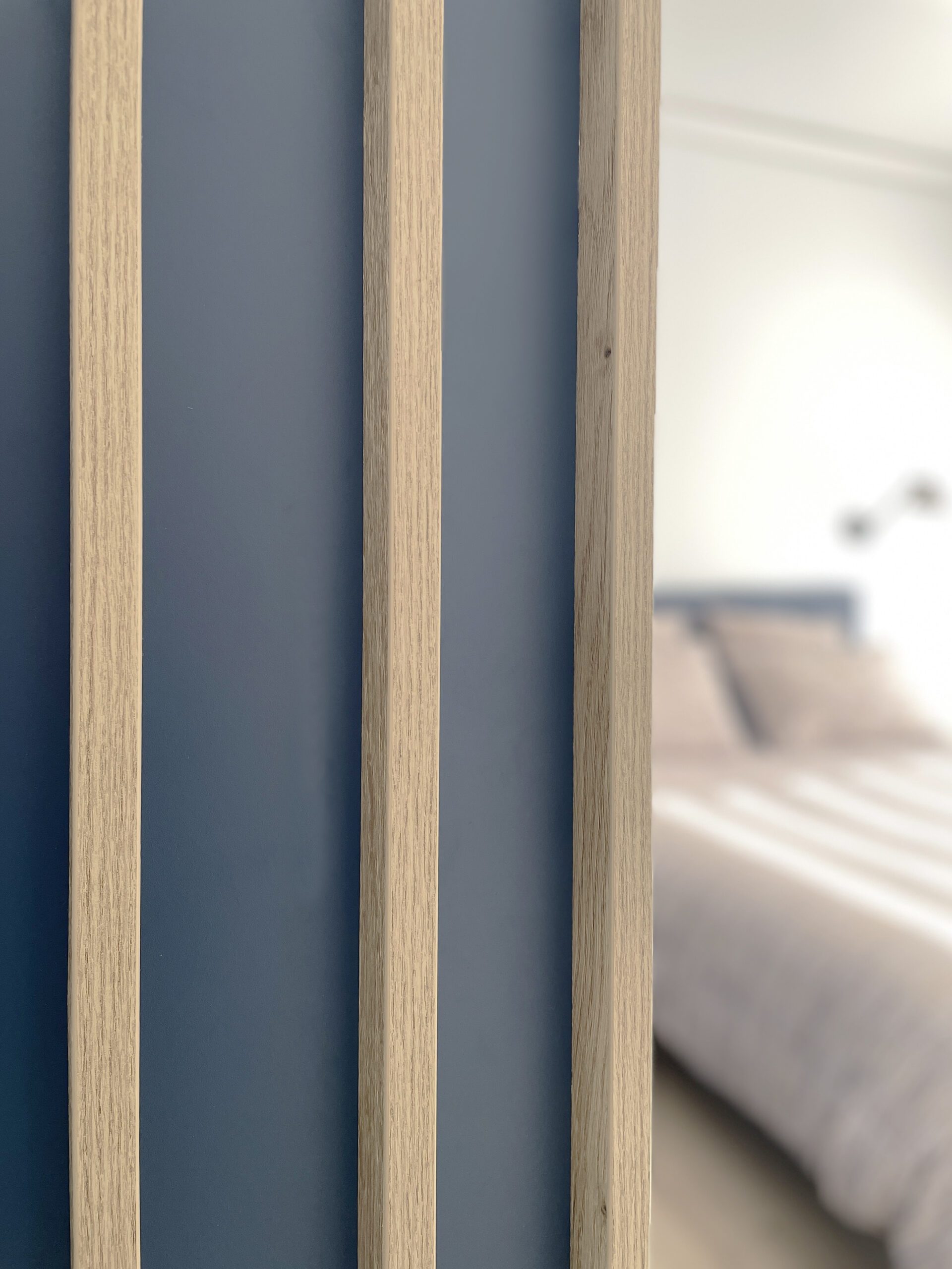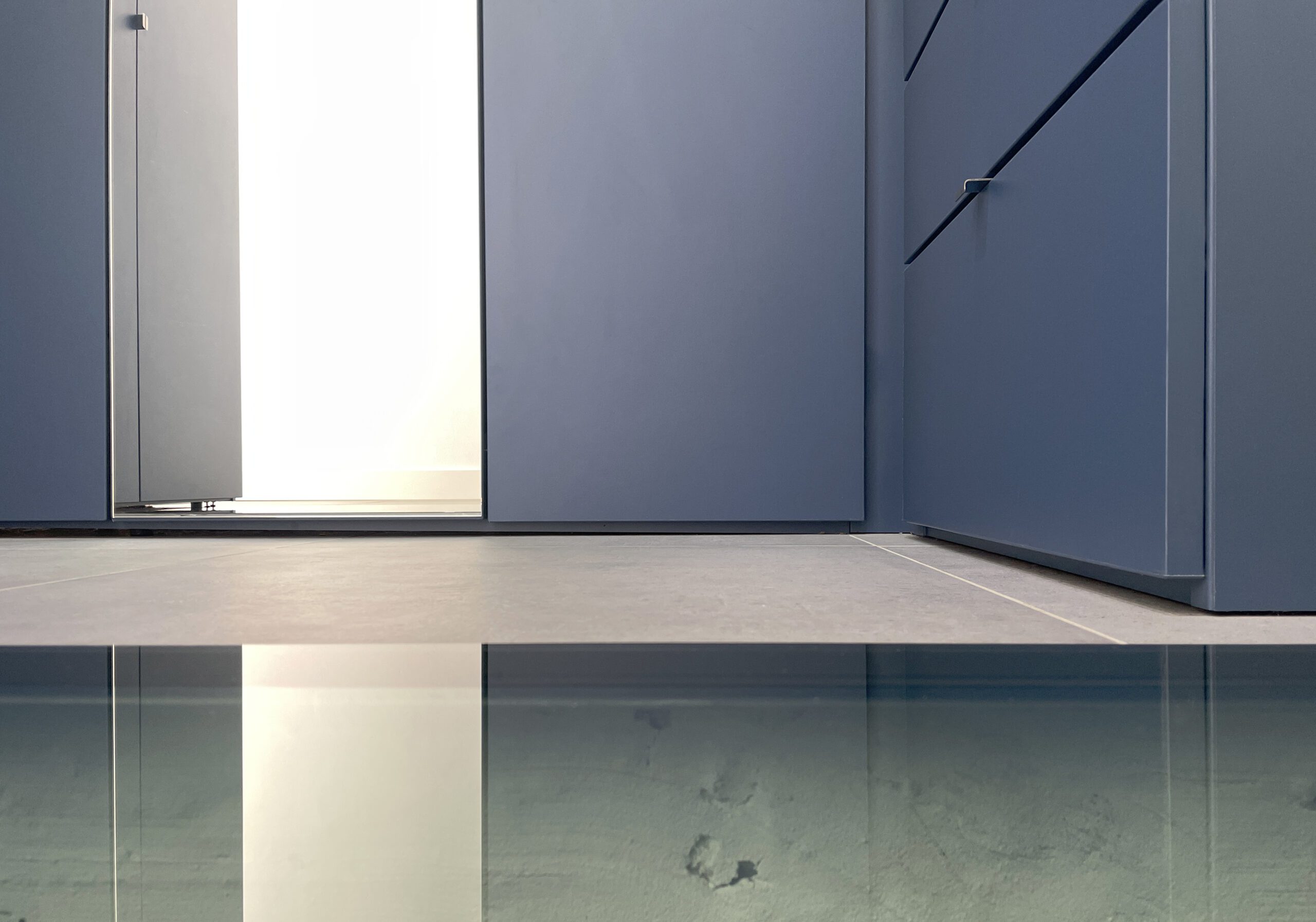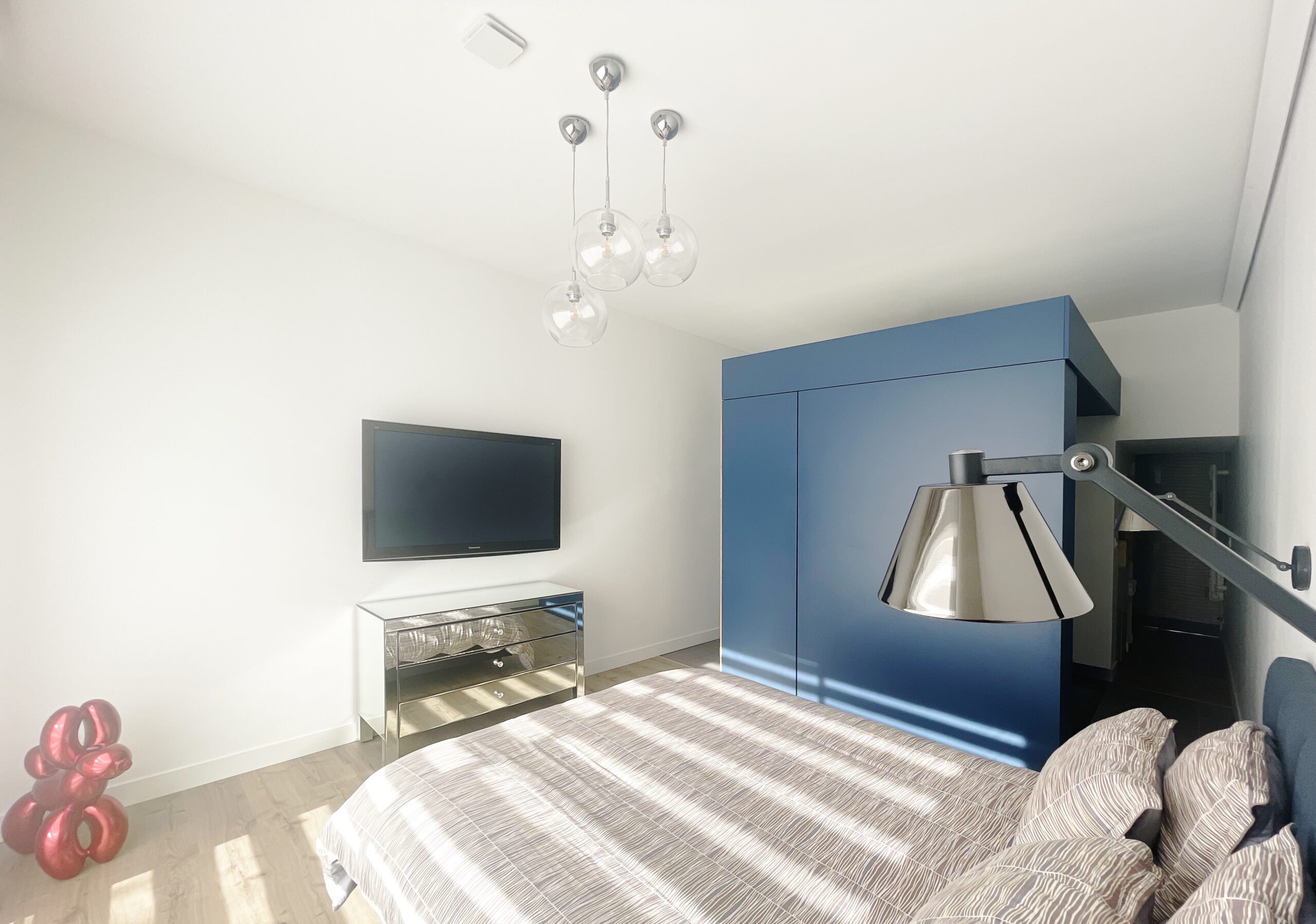 Il a alors été dessiné et conçu une « boîte bleue » menuisée. Cet élément aux multiples rangements offre un dressing complet, éclairé par 3 spots encastrés, intégrant l’édicule d’accès au sous-sol.