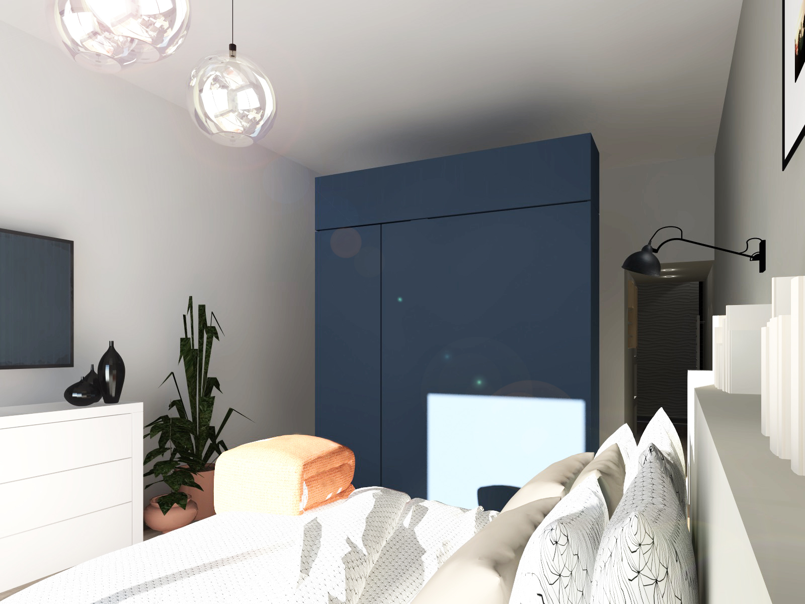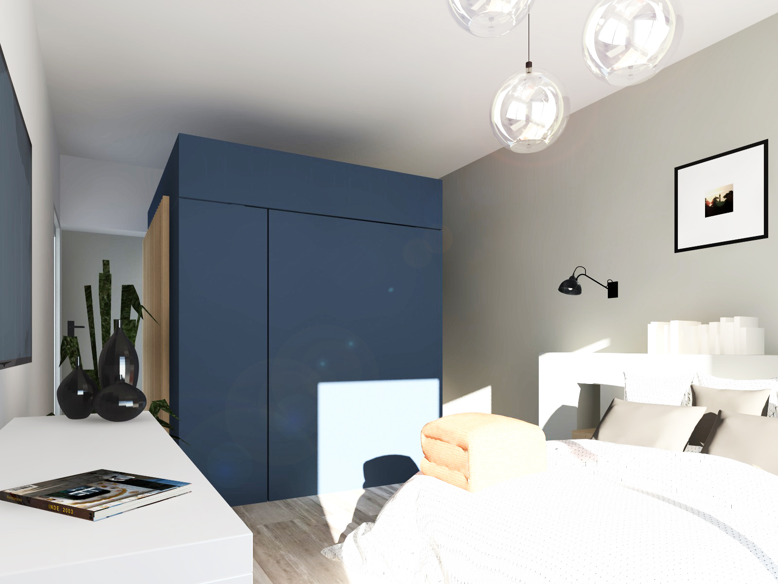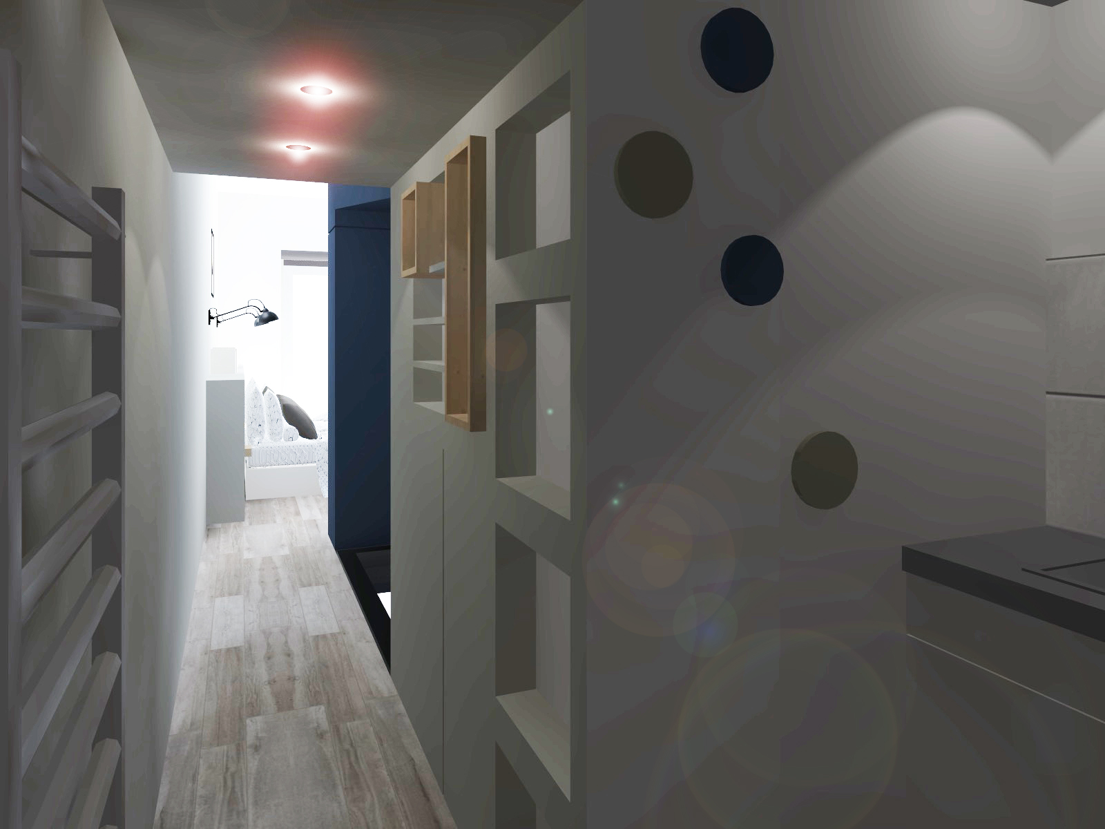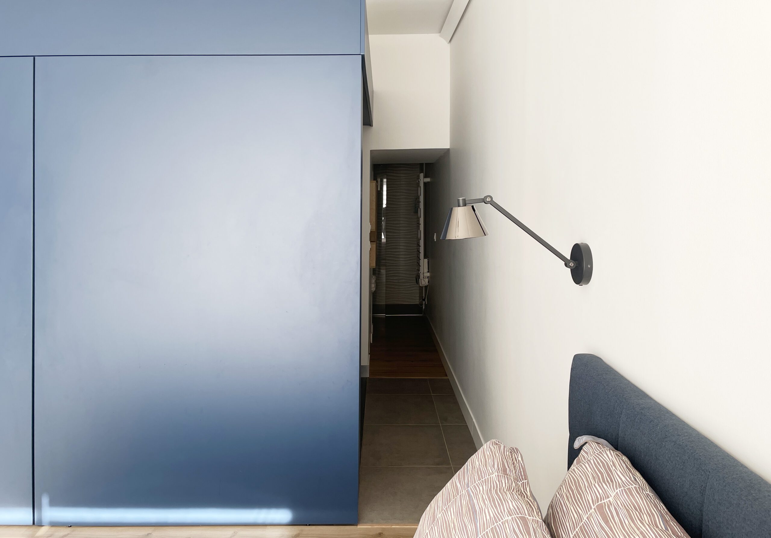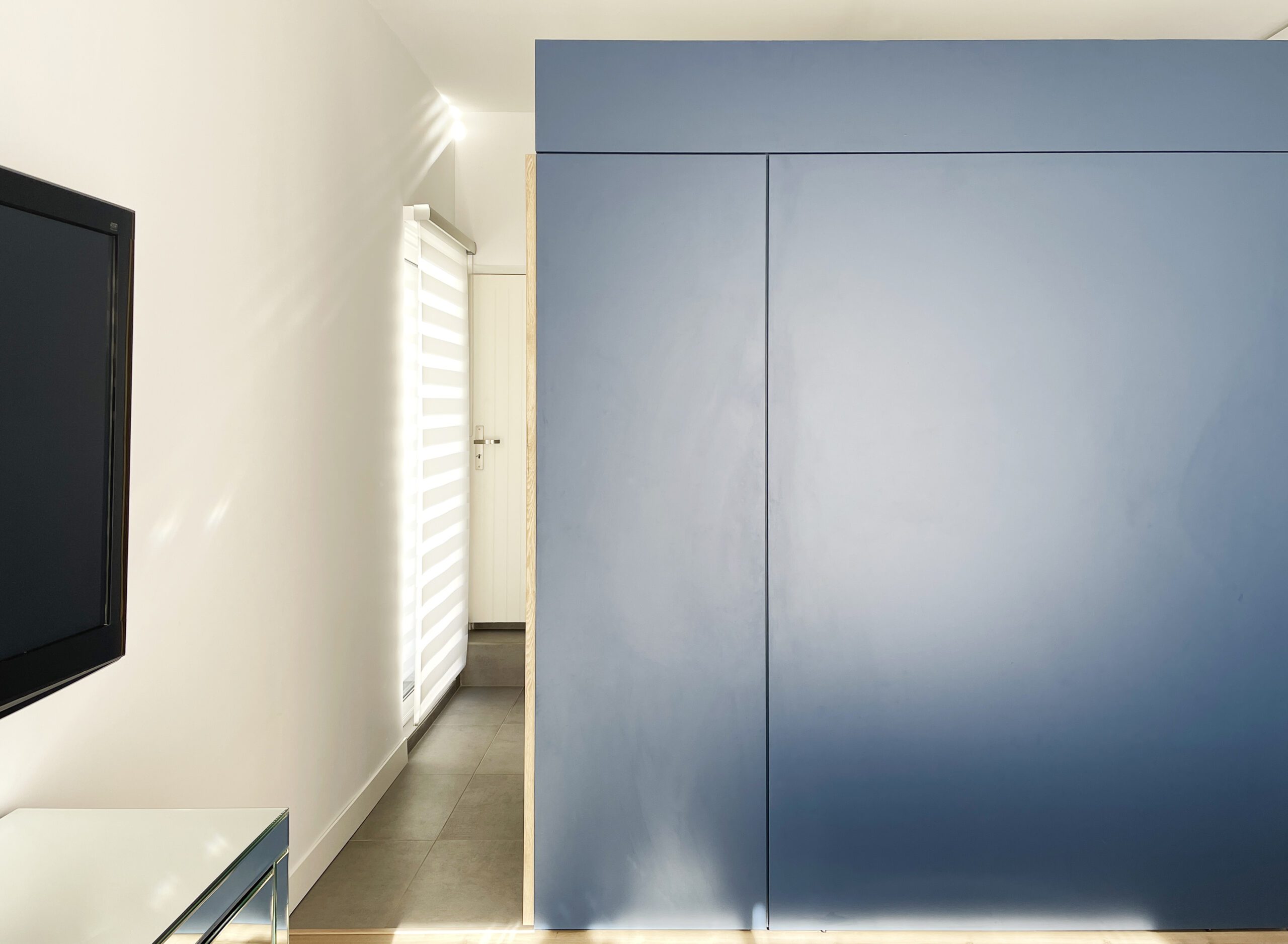 Depuis la porte d’entrée de la suite, cette « boîte bleue » fonctionnelle séquence la déambulation à travers la pièce et structure l’espace.