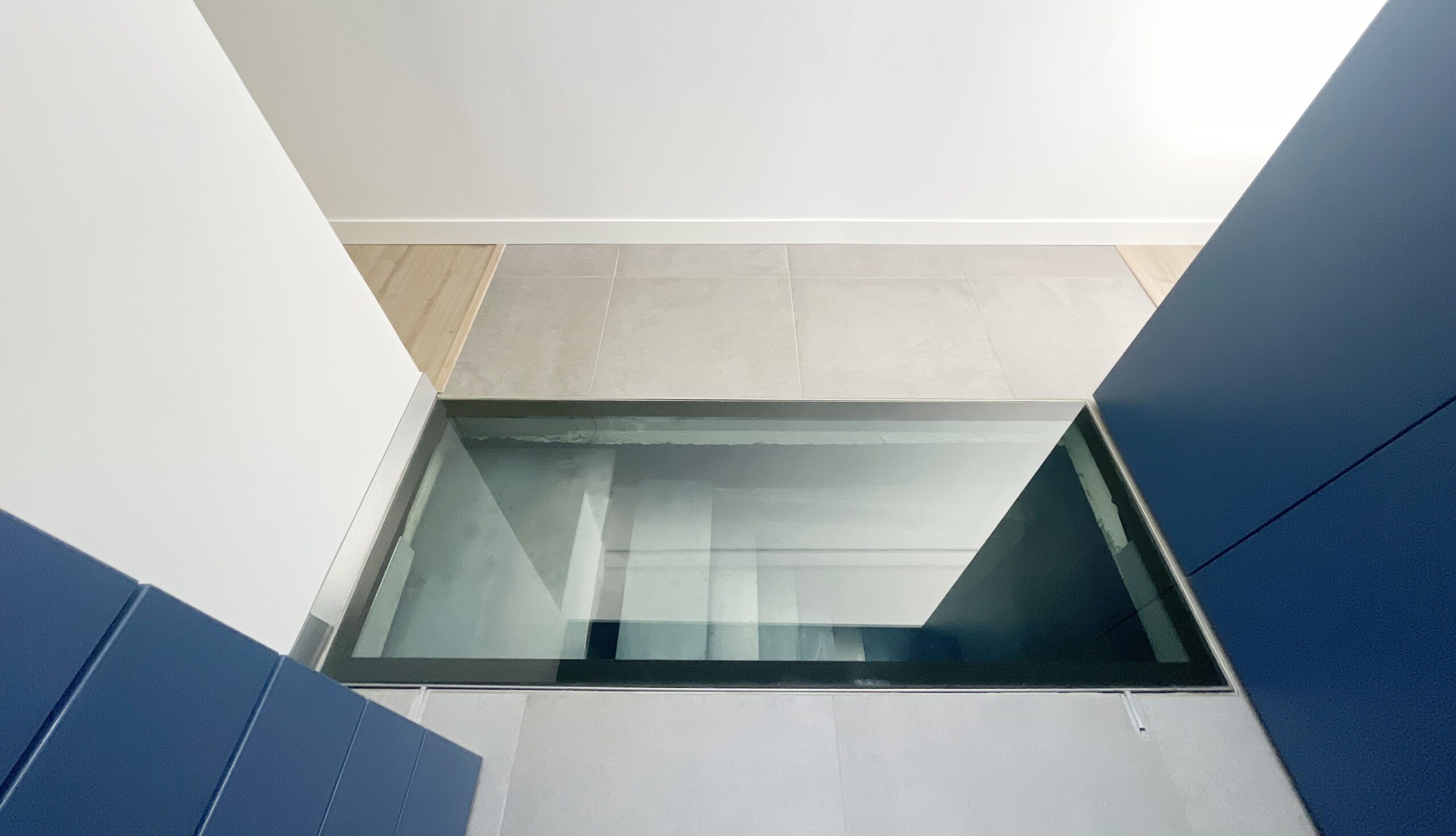 Au centre, une trappe vitrée montée sur vérins permet d’accéder au sous-sol de manière sécurisée.