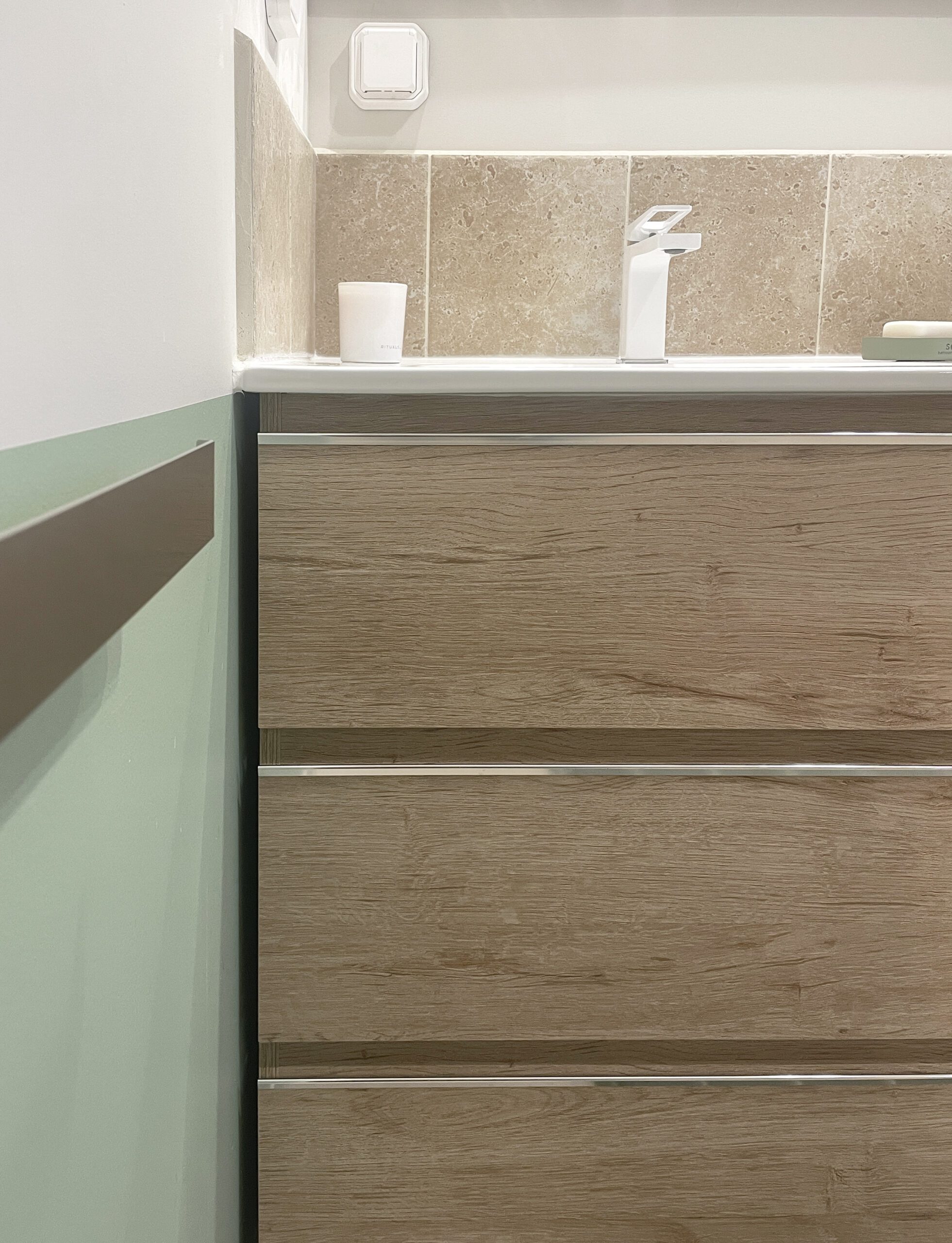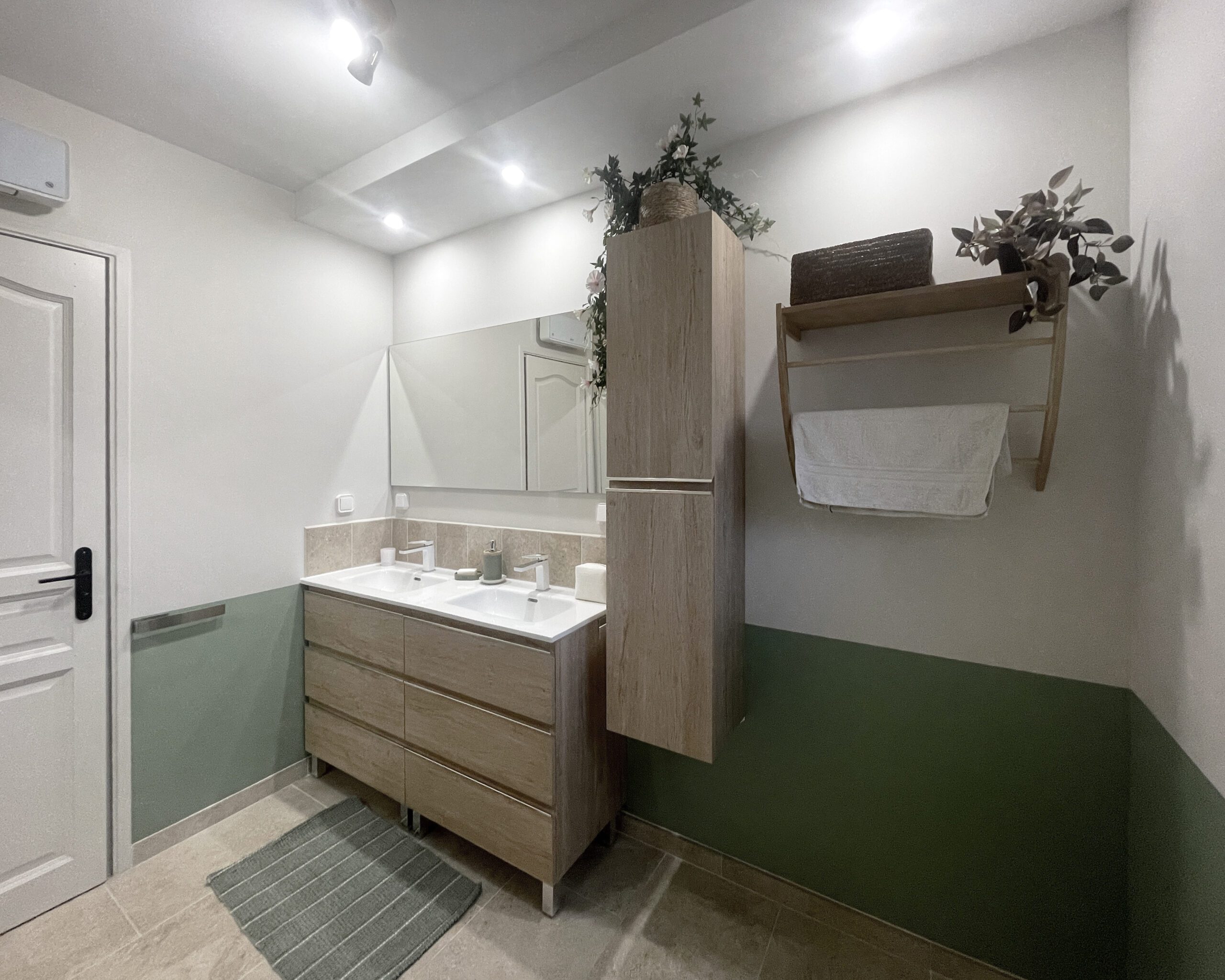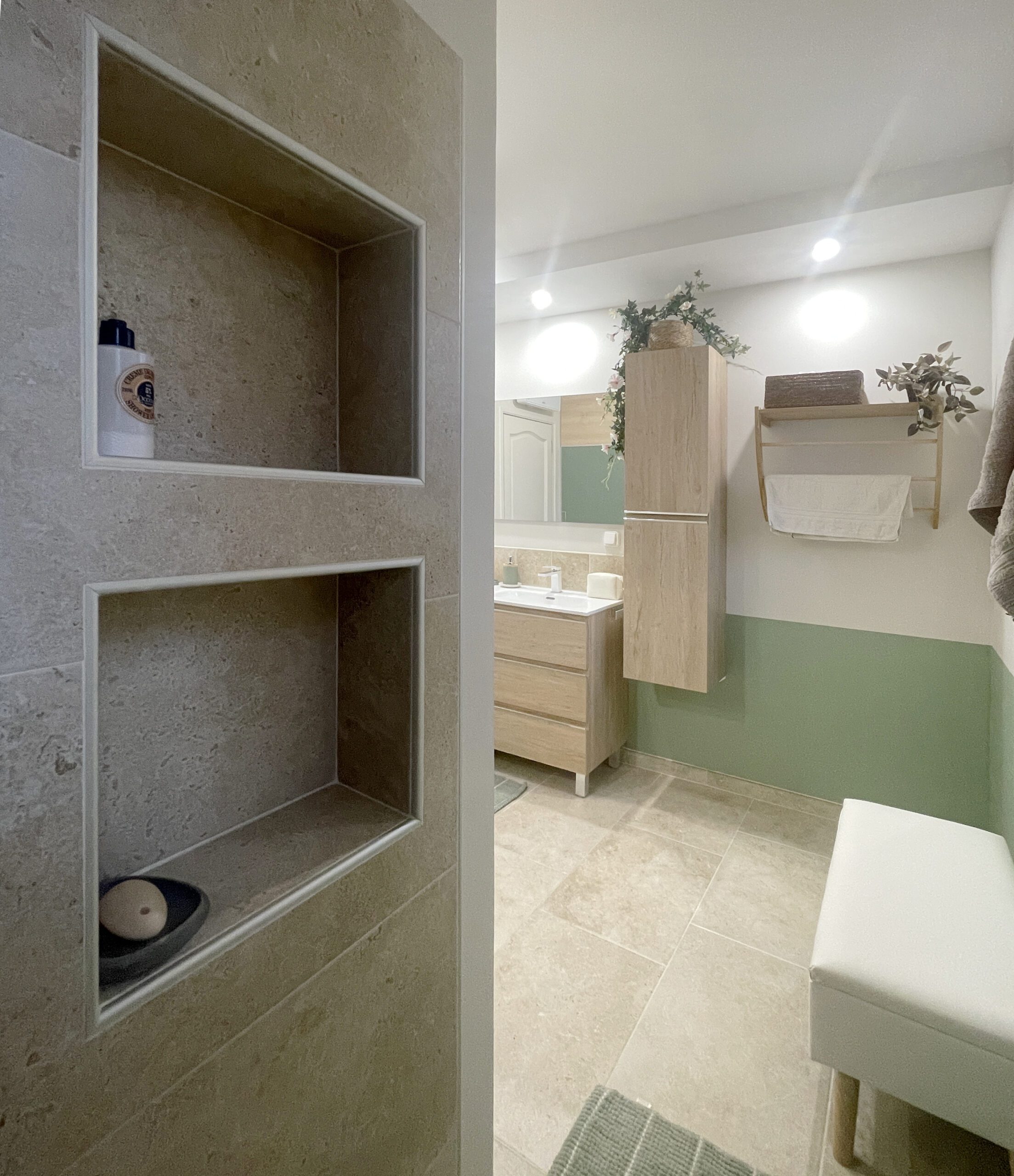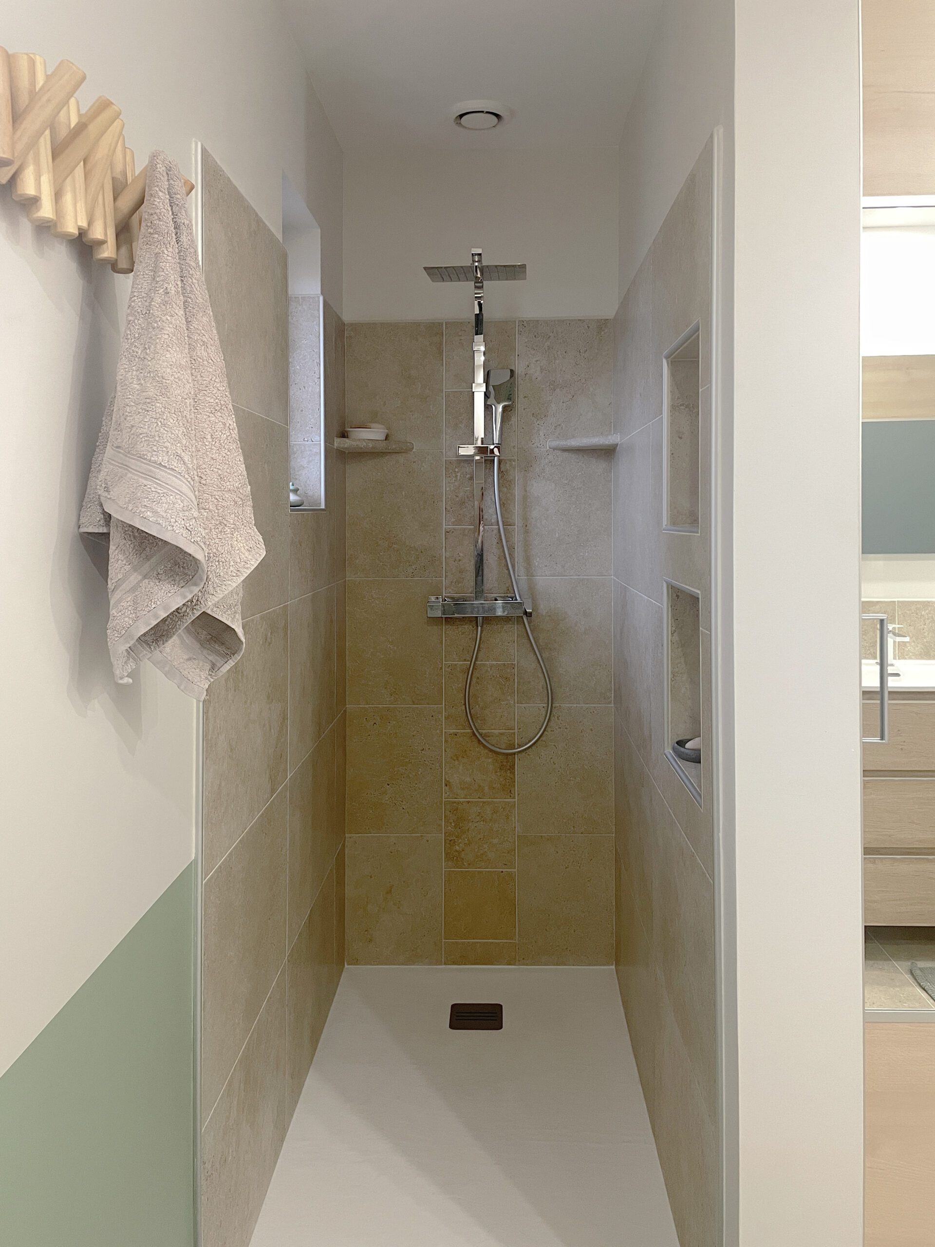 Toutes les surfaces murales ont été doublées avec du placo hydrofuge, recouvert de travertin ou de peinture selon les zones. Le travertin, matériau traditionnel, est équilibré par un soubassement vert sauge lumineux et contemporain.
