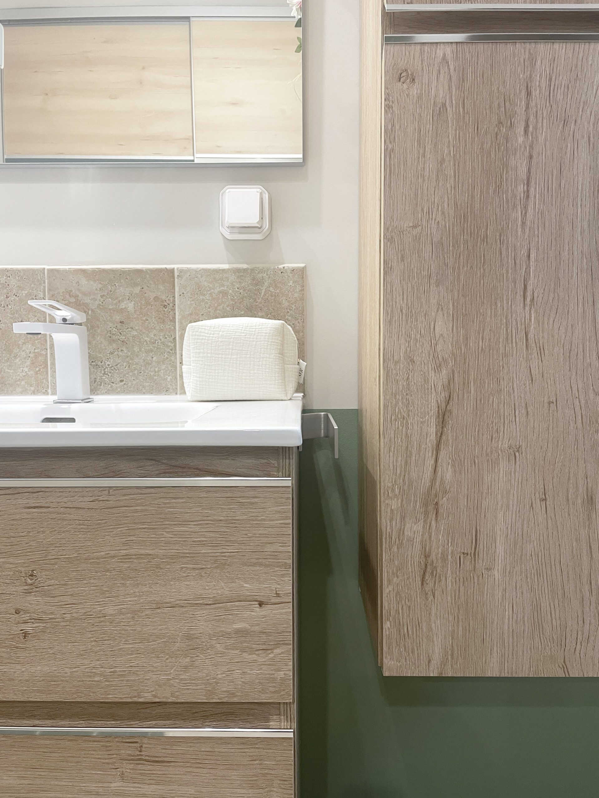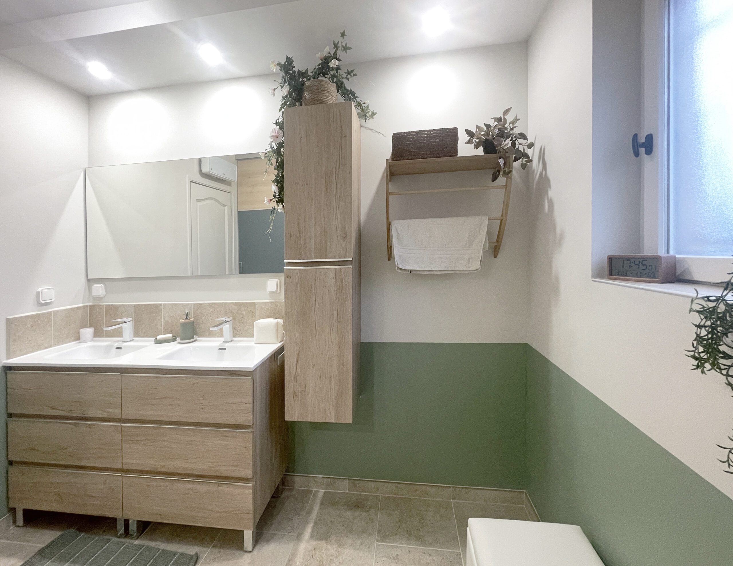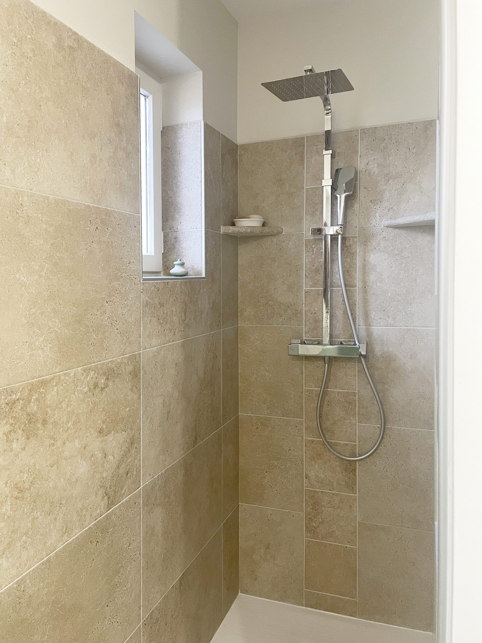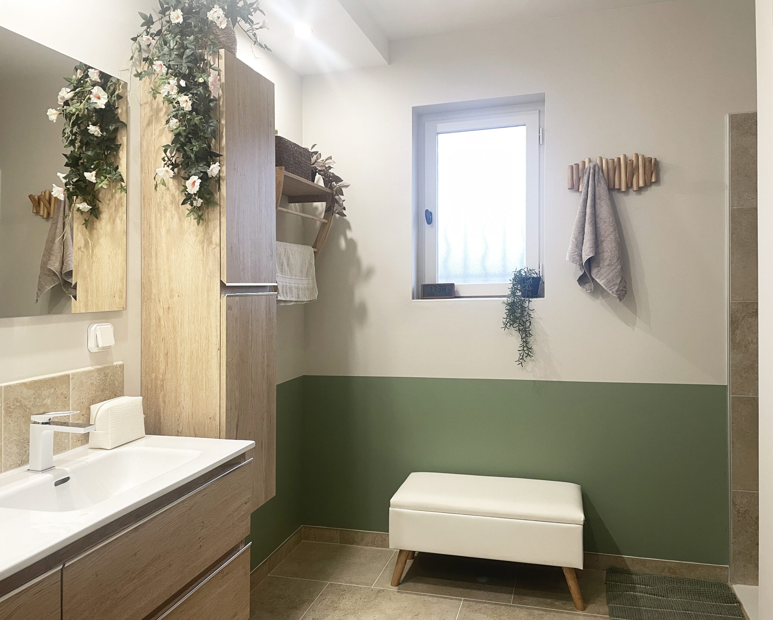 Toutes les surfaces murales ont été doublées avec du placo hydrofuge, recouvert de travertin ou de peinture selon les zones. Le travertin, matériau traditionnel, est équilibré par un soubassement vert sauge lumineux et contemporain.
