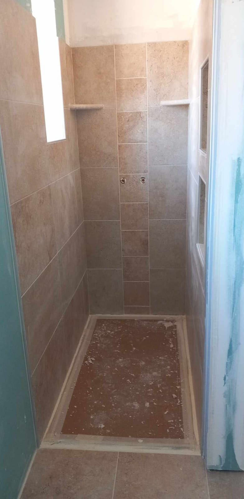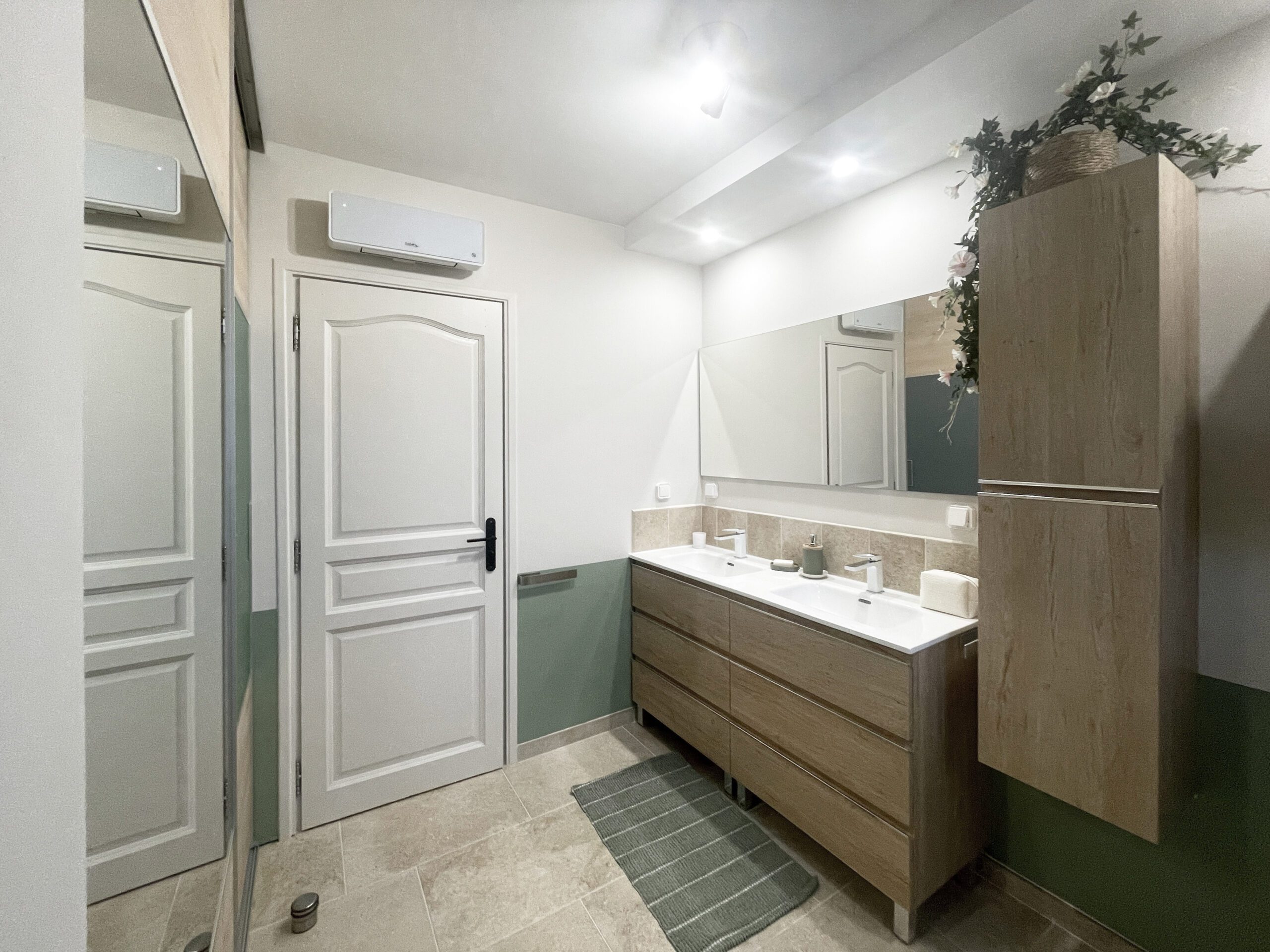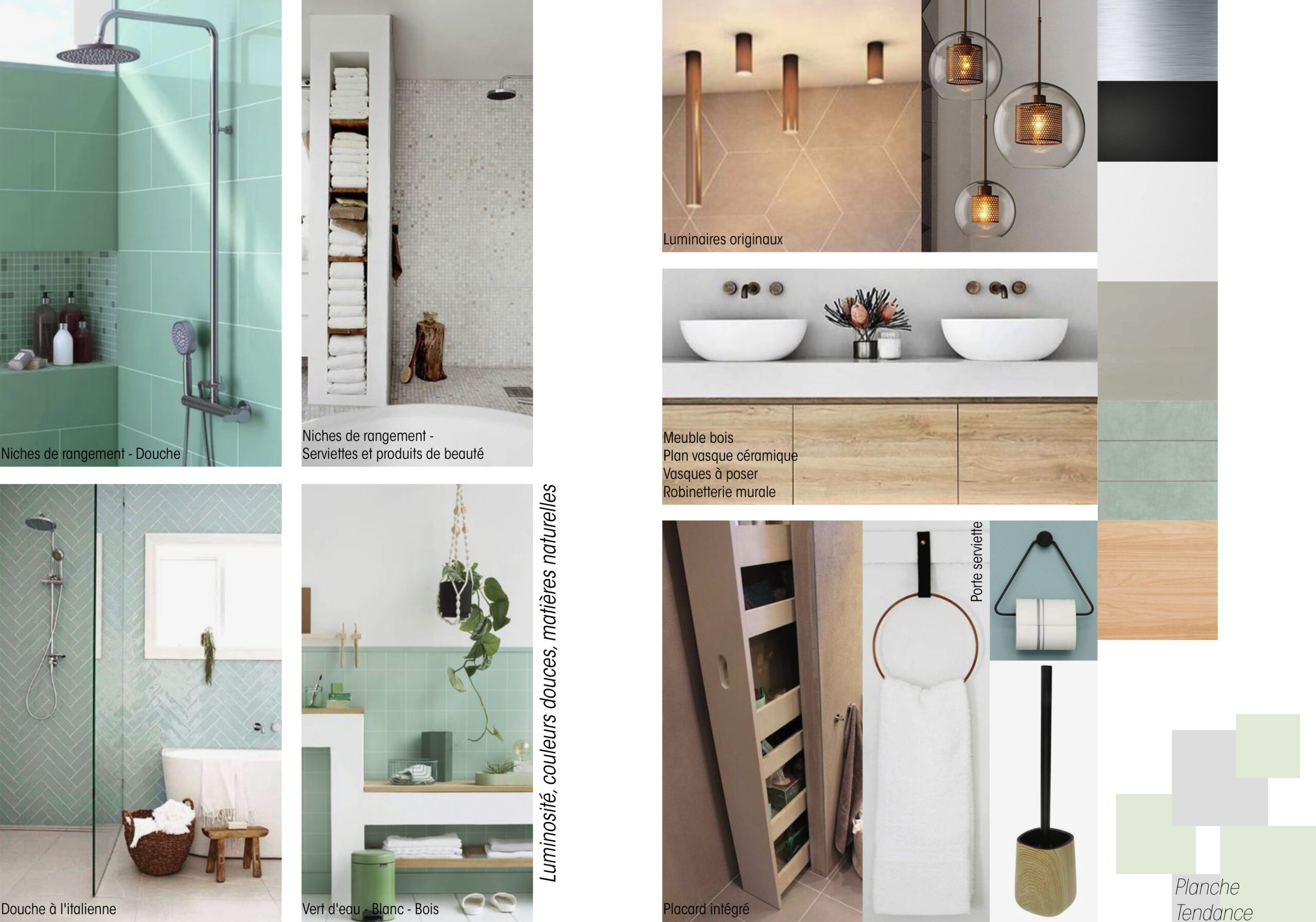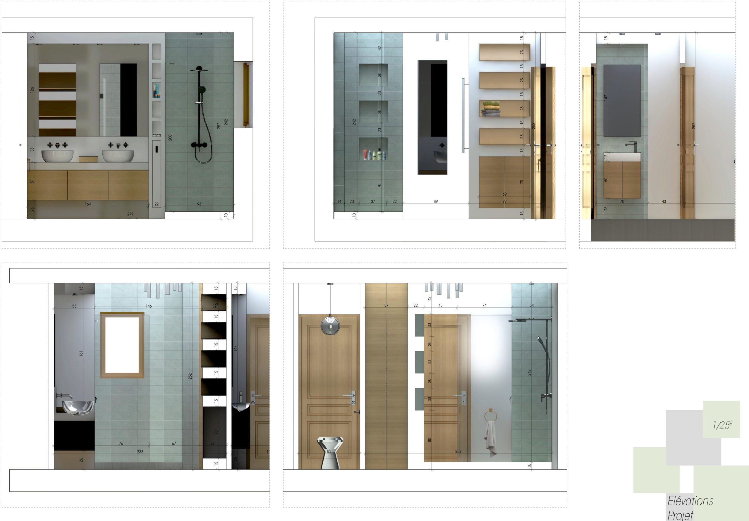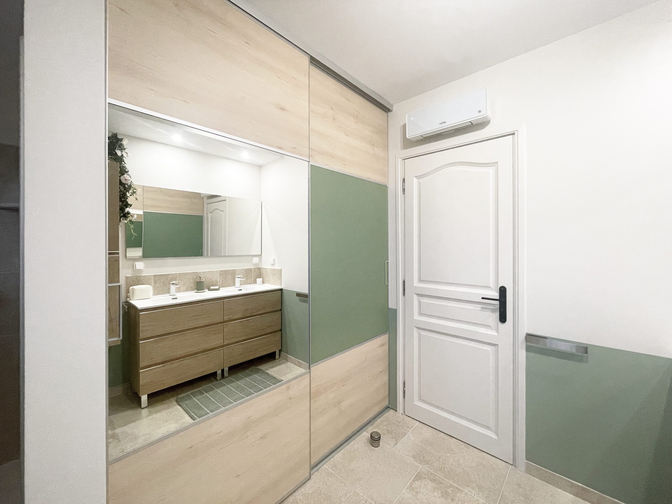 Toutes les surfaces murales ont été doublées avec du placo hydrofuge, recouvert de travertin ou de peinture selon les zones. Le travertin, matériau traditionnel, est équilibré par un soubassement vert sauge lumineux et contemporain.