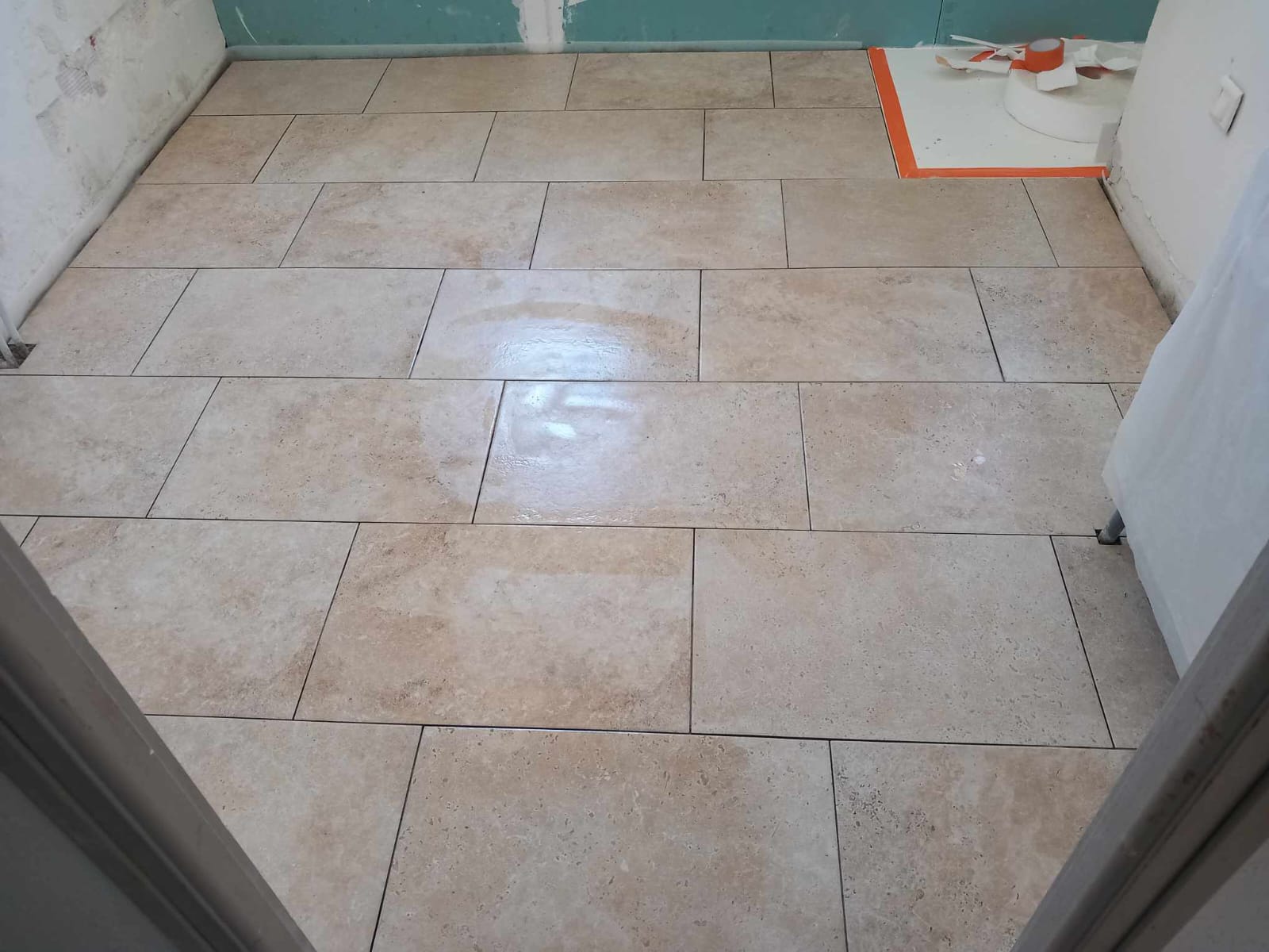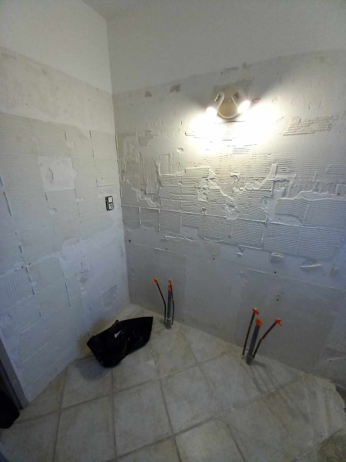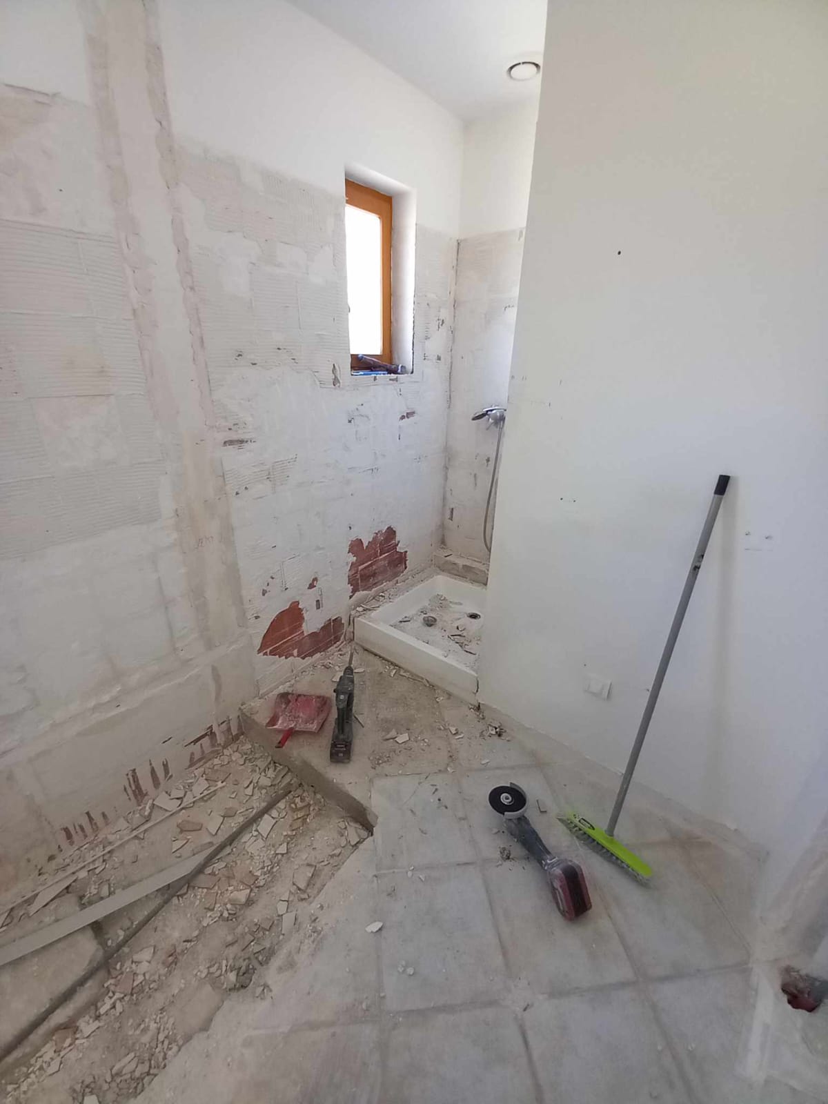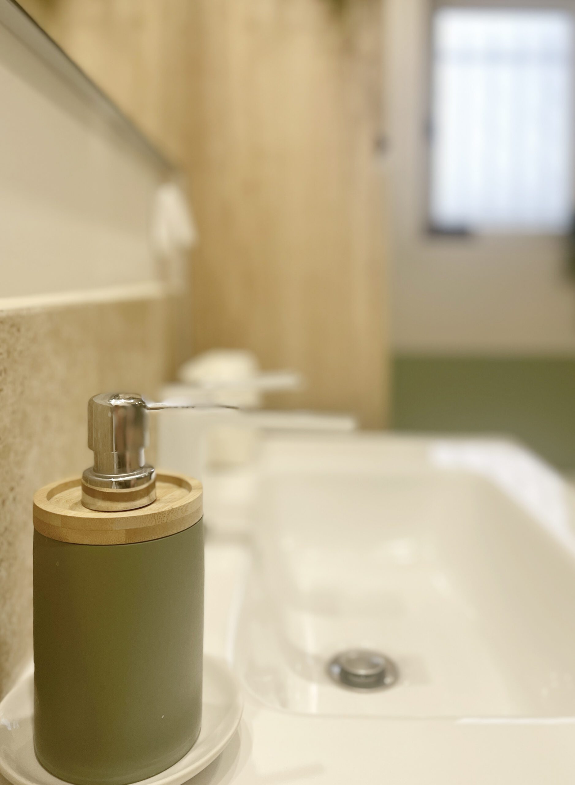 Toutes les surfaces murales ont été doublées avec du placo hydrofuge, recouvert de travertin ou de peinture selon les zones. Le travertin, matériau traditionnel, est équilibré par un soubassement vert sauge lumineux et contemporain.