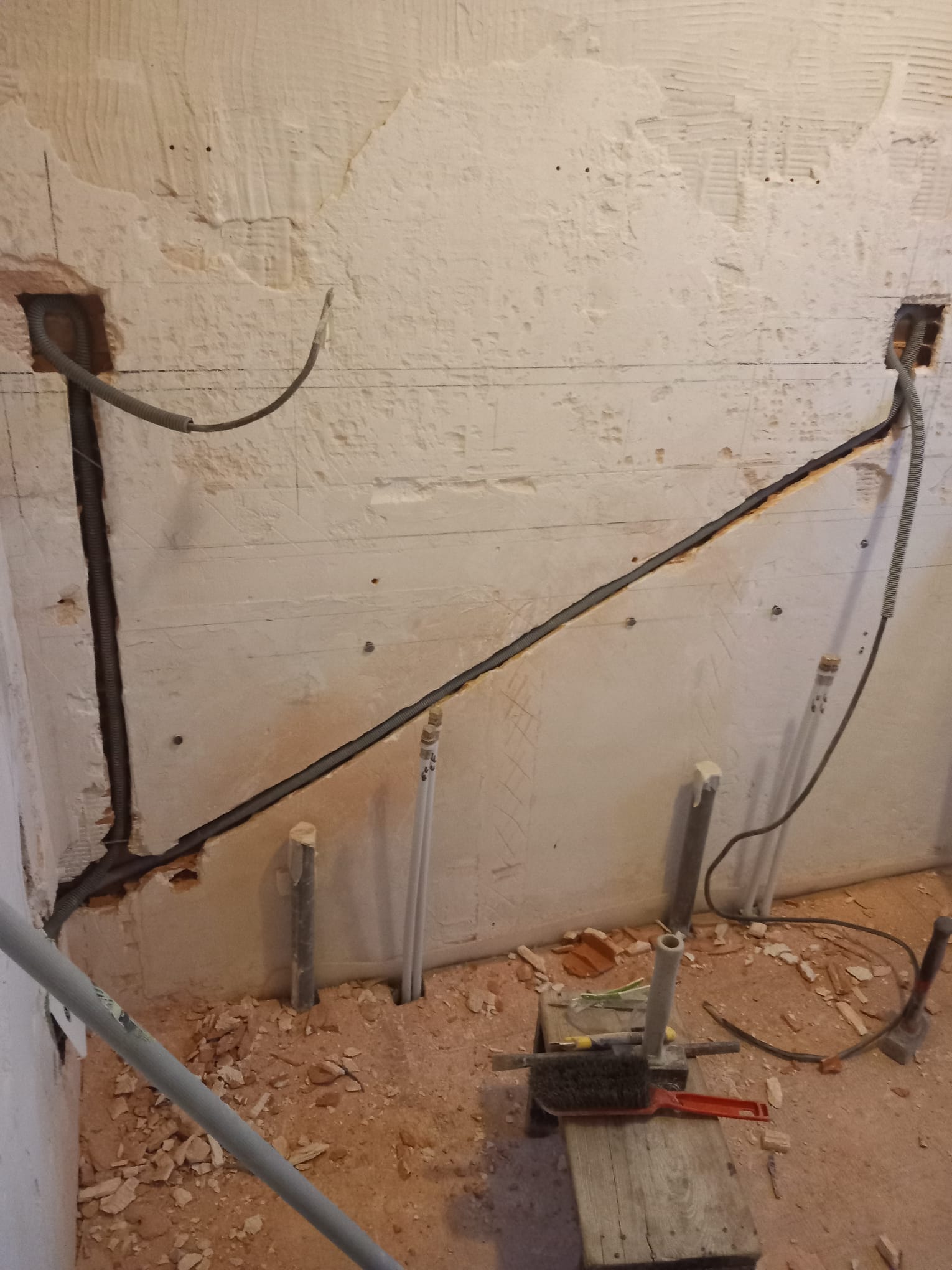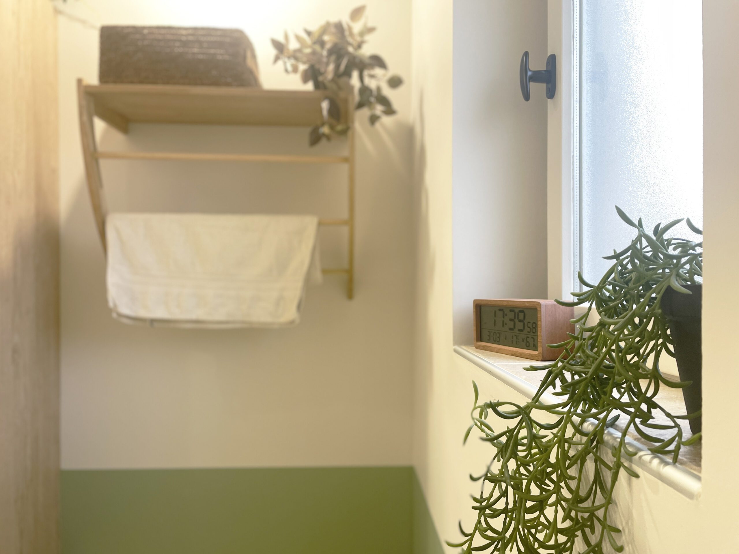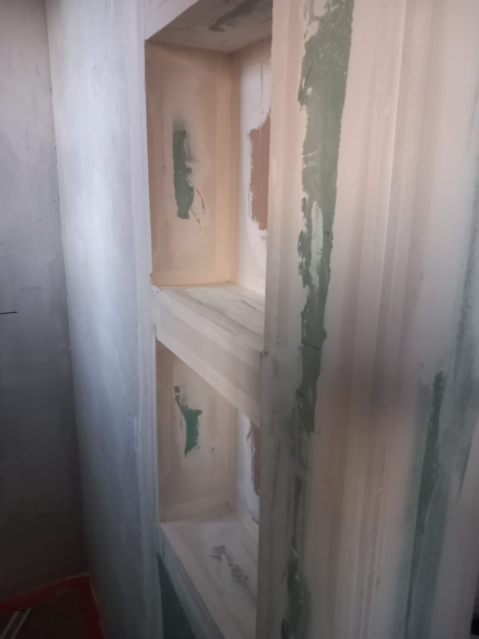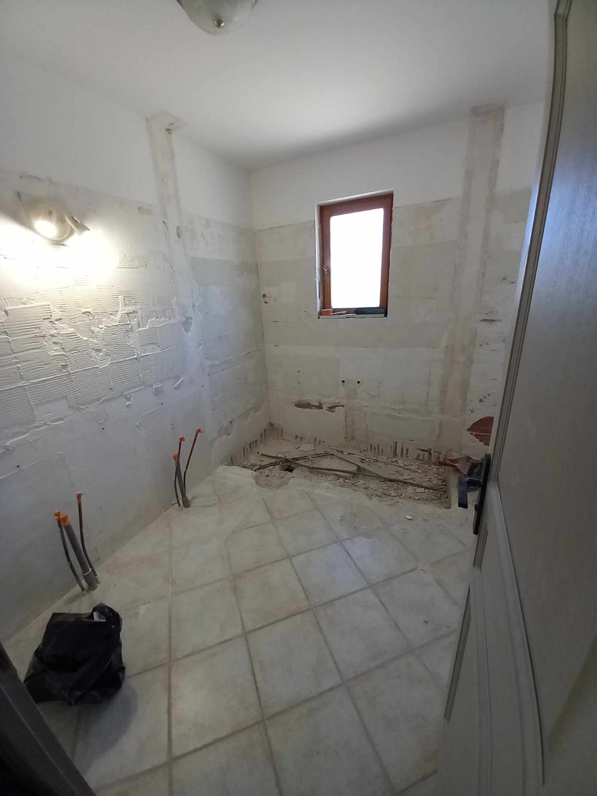Toutes les surfaces murales ont été doublées avec du placo hydrofuge, recouvert de travertin ou de peinture selon les zones. Le travertin, matériau traditionnel, est équilibré par un soubassement vert sauge lumineux et contemporain.