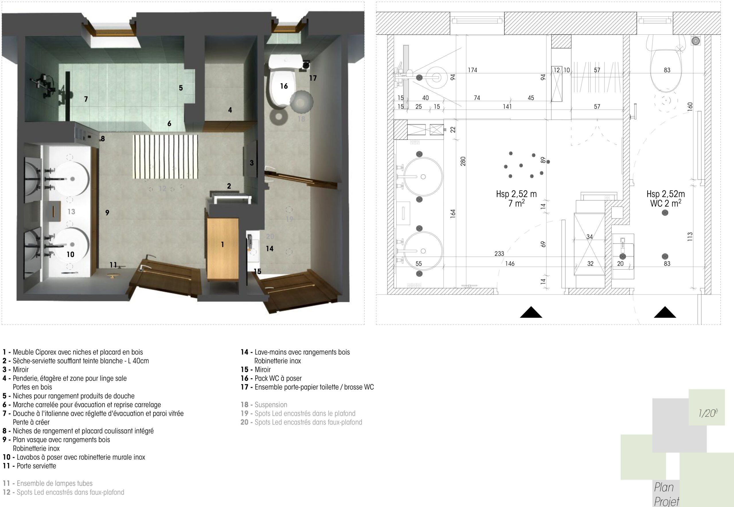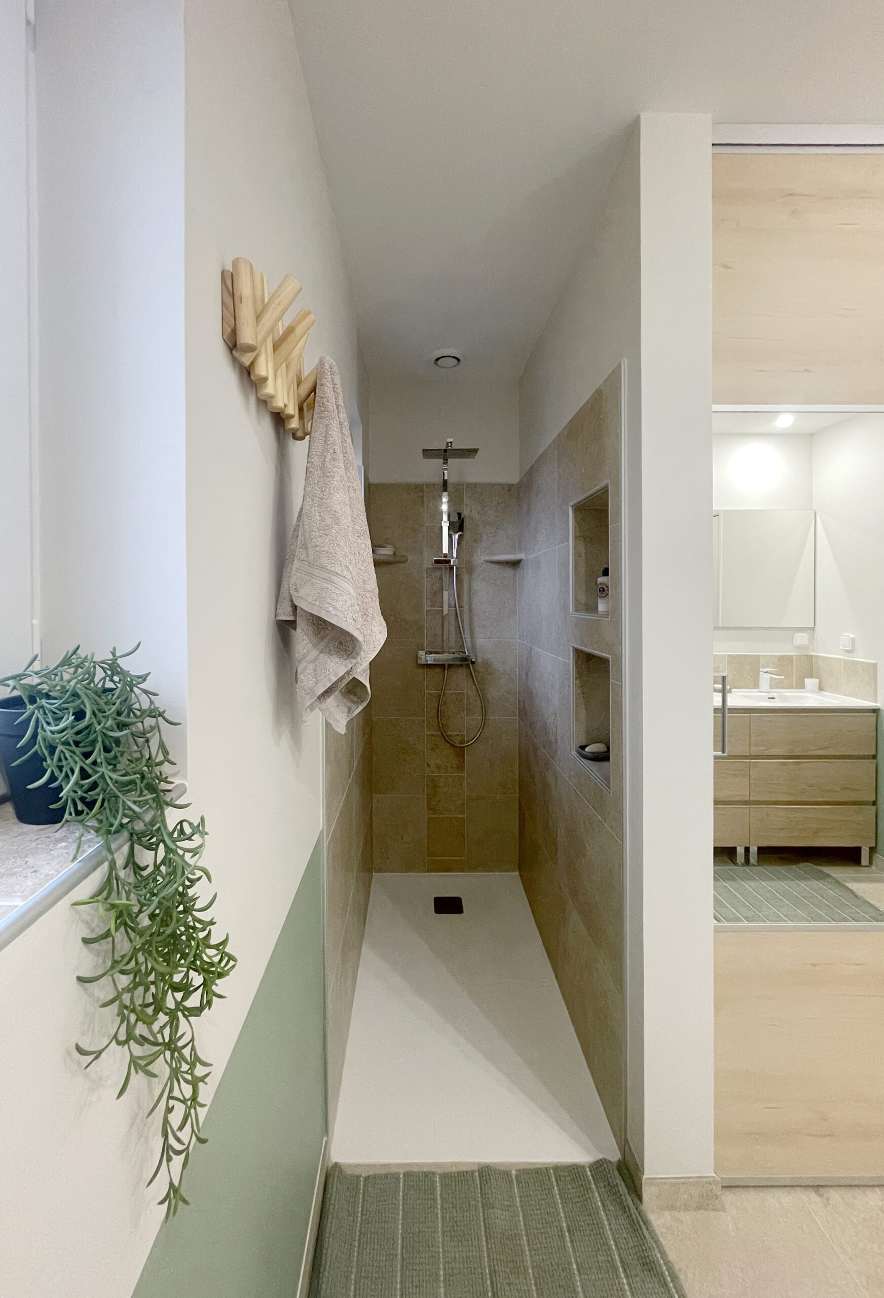 Il a donc été décidé de conserver la douche à son emplacement originel pour limiter les interventions sur les réseaux existants. Cette douche a été prolongée afin d’être spacieuse et agréable. La nouvelle cloison séparative de la douche offre des niches d’un côté et termine le grand placard aux aménagements menuisés.